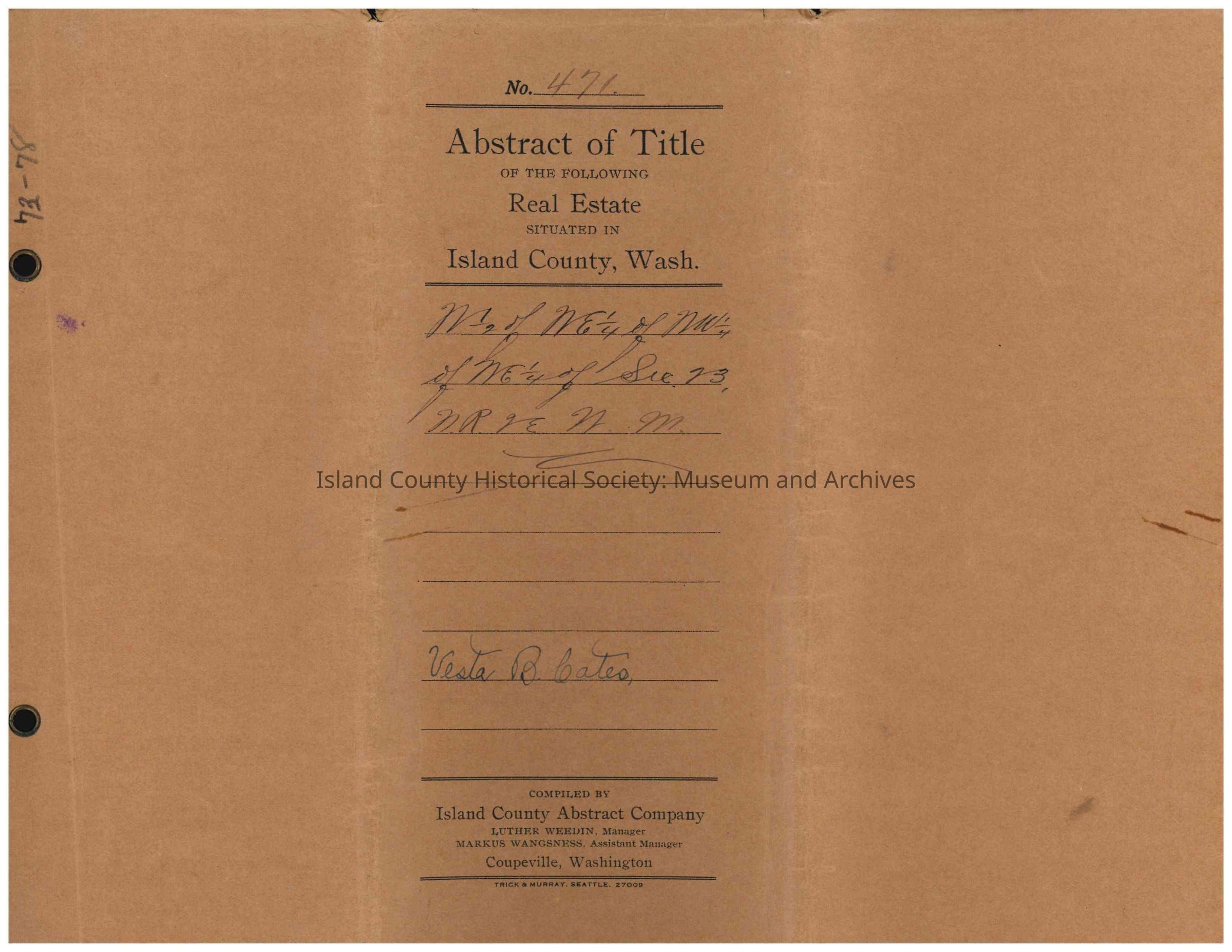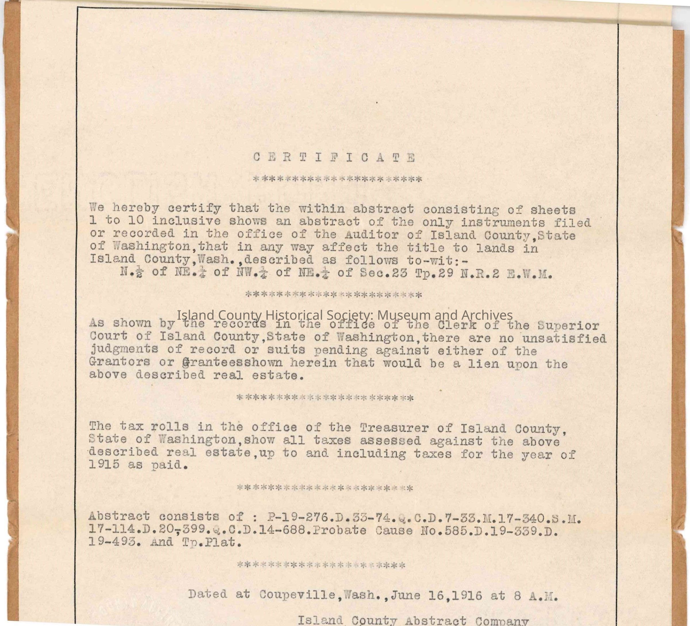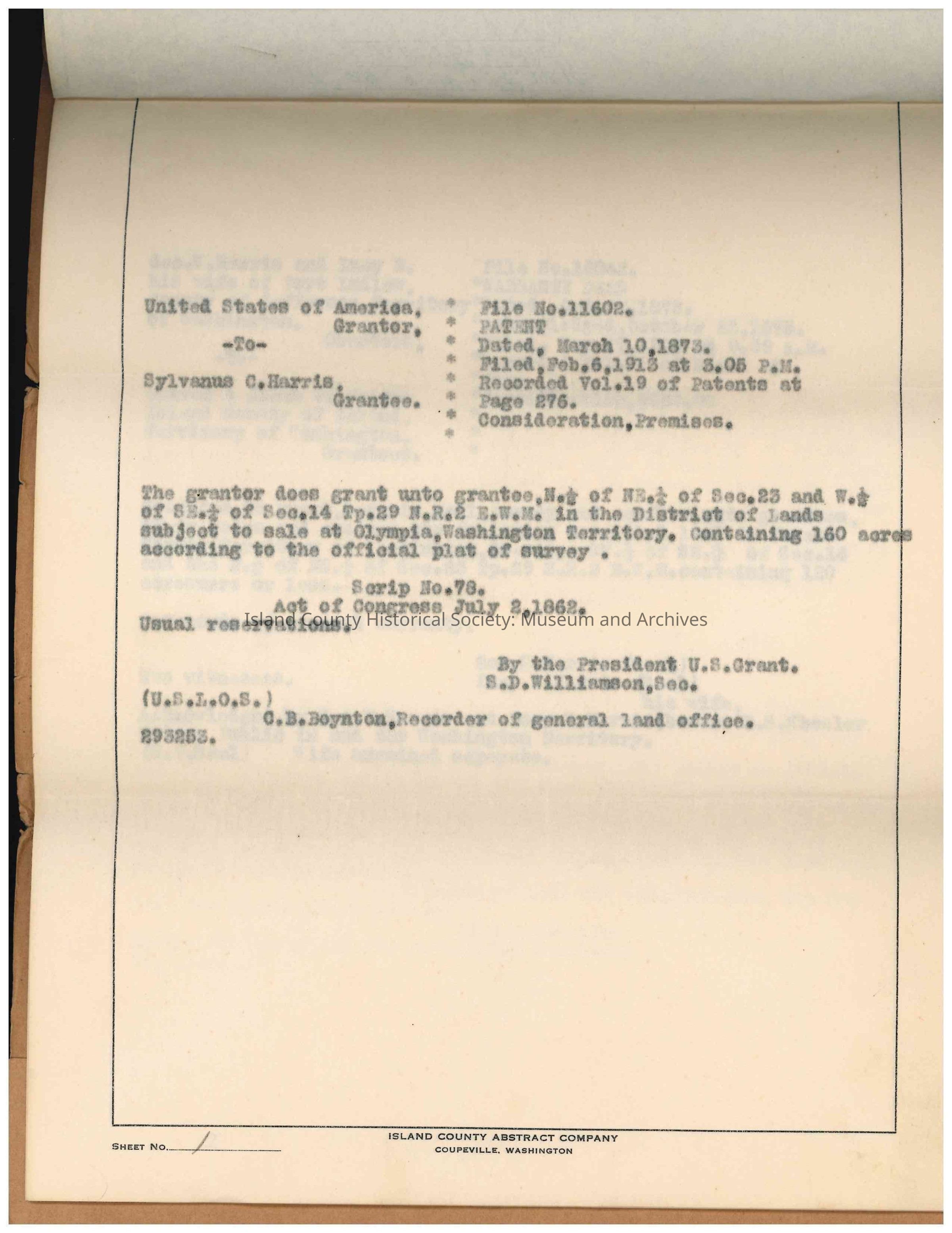 Abstract of Title for a portion of land on Whidbey Island, granted to Sylvanus C. Harris by the United States of America, for the following land: "N. 1/2 of NE. 1/4 of NW. 1/4 of NE. 1/4 of Sec. 23 Tp. 29 N.R.2 E.W.M." Dated 10 March 1873, filed 06 February 1913.