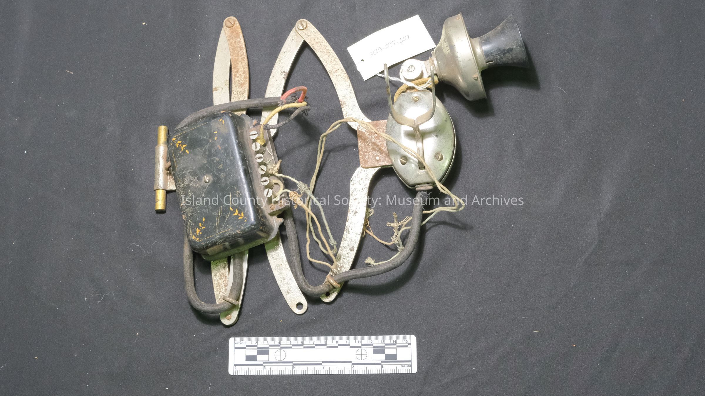 Telephone, accordian style to be pulled out from it's mounted position. Missing receiver piece. Marked as manufactured by Stromberg-Carlson, Rochester, NY. Reported to have been from Coates Electric store in Coupeville - owned by Coates brothers, Clarence and Vernon. Donated with other radio items and a history write up adapted from "The Stromberg-Carlson Store", Rochester Commerce, Sept. 1954 - which will be kept with Deed of Gift paperwork.