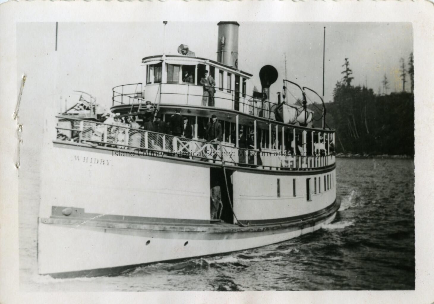 This photo is black and white. In the photo, The name of the boat, shown on the bow, is "Whidby". The Whidby was docked at Maylor's dock in Oak Harbor when it caught fire and burned on May 9, 1911.Lexicon