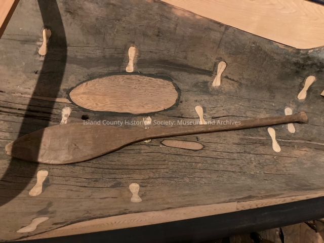 Old hand carved Indigenous canoe paddle. Portion of top handle broken off. Donated by Ron Van Dyk. My uncle, John Van Dyk, found it on the beach at Oak Harbor in 1920s or 30s. Donated in his uncle's name: John Van Dyk