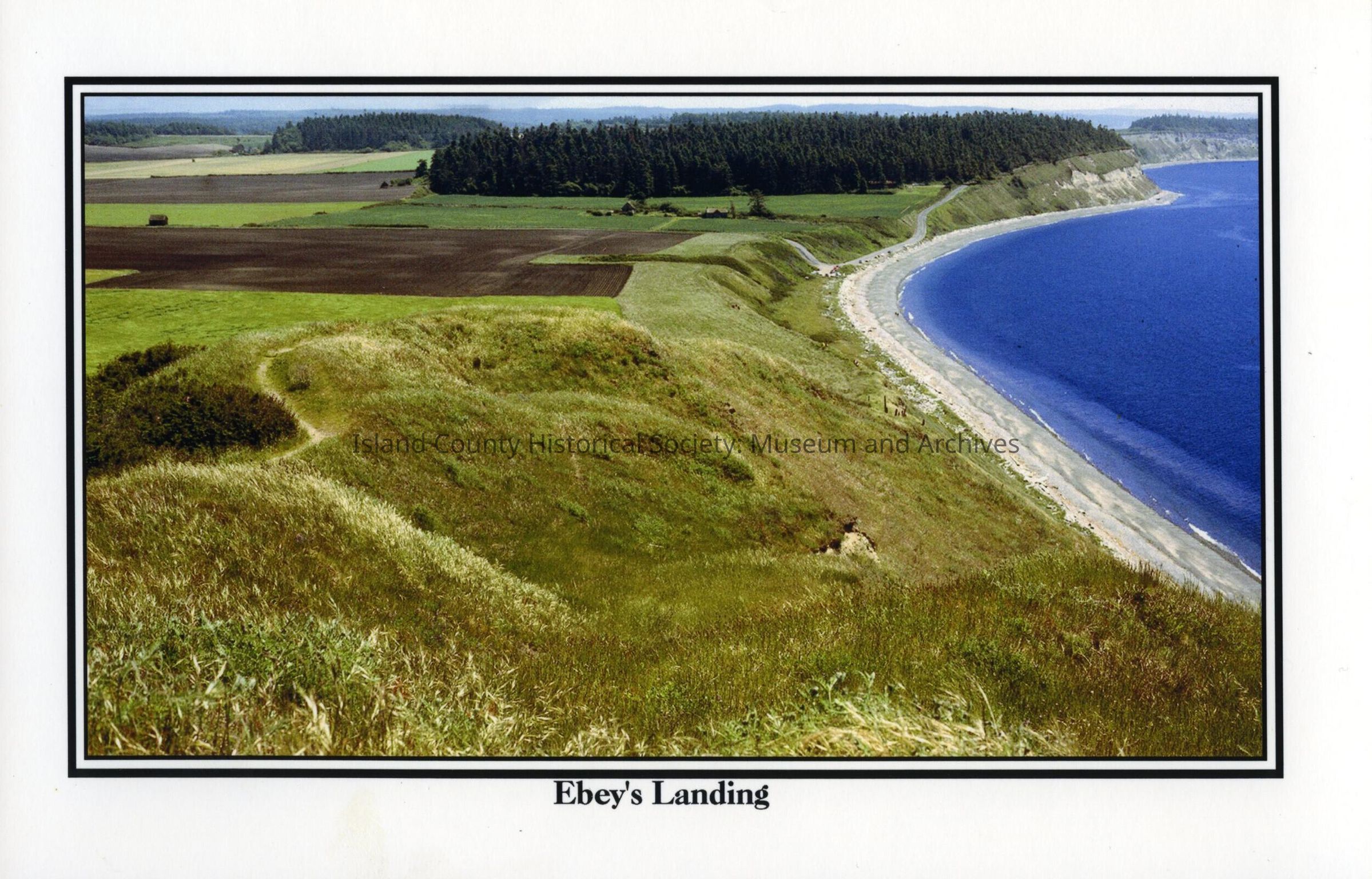 This is an easterly view from the bluff overlooking Ebey's Prairie and the beach on Puget Sound. The view shows Ebey's Prairie farm fields nearest Ebey's Landing. The Ferry House is visible, as well as the Ebey's Landing parking area and Hill Road. Ebey's Admiralty Inset is at the top right of the photo.