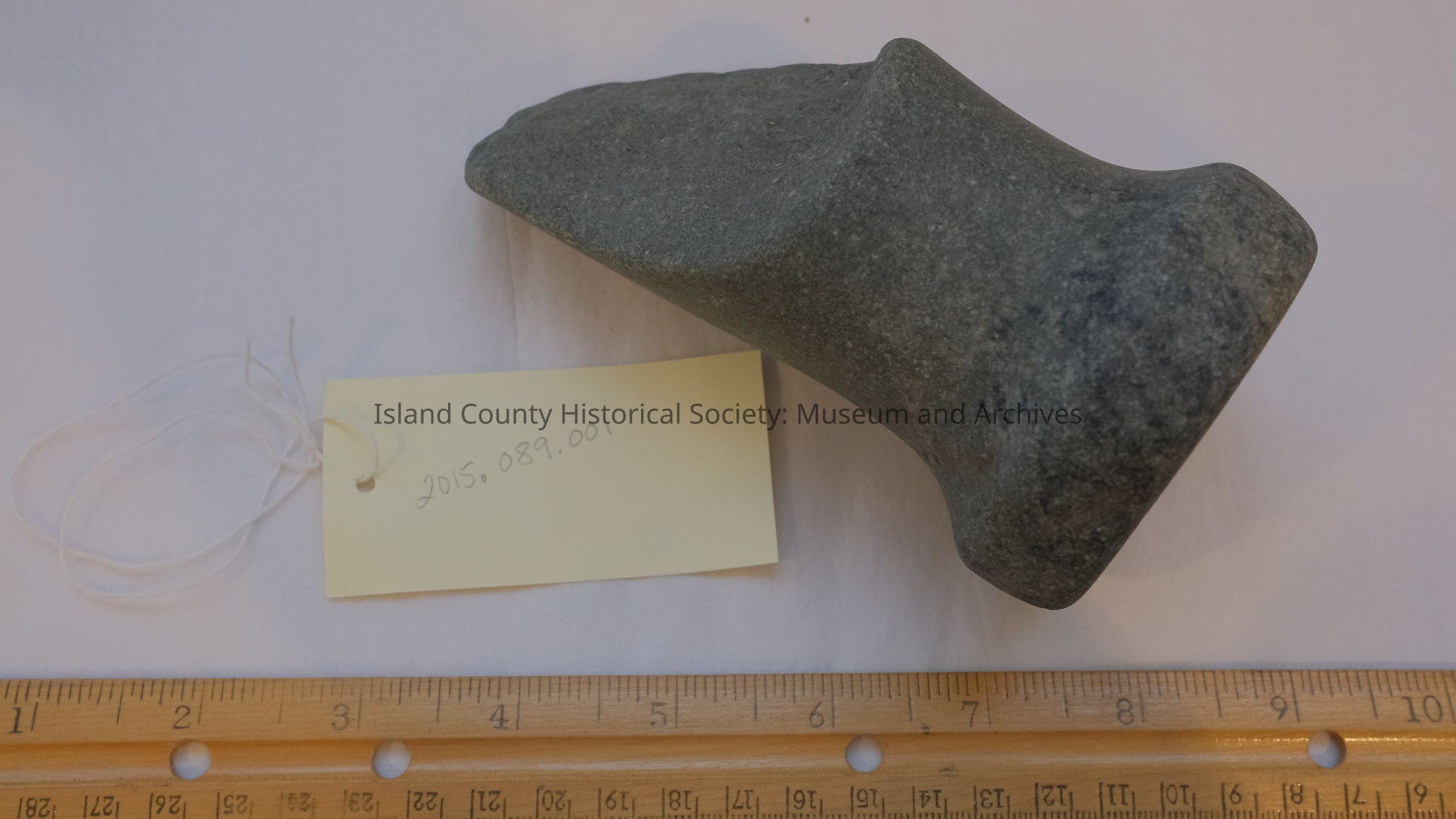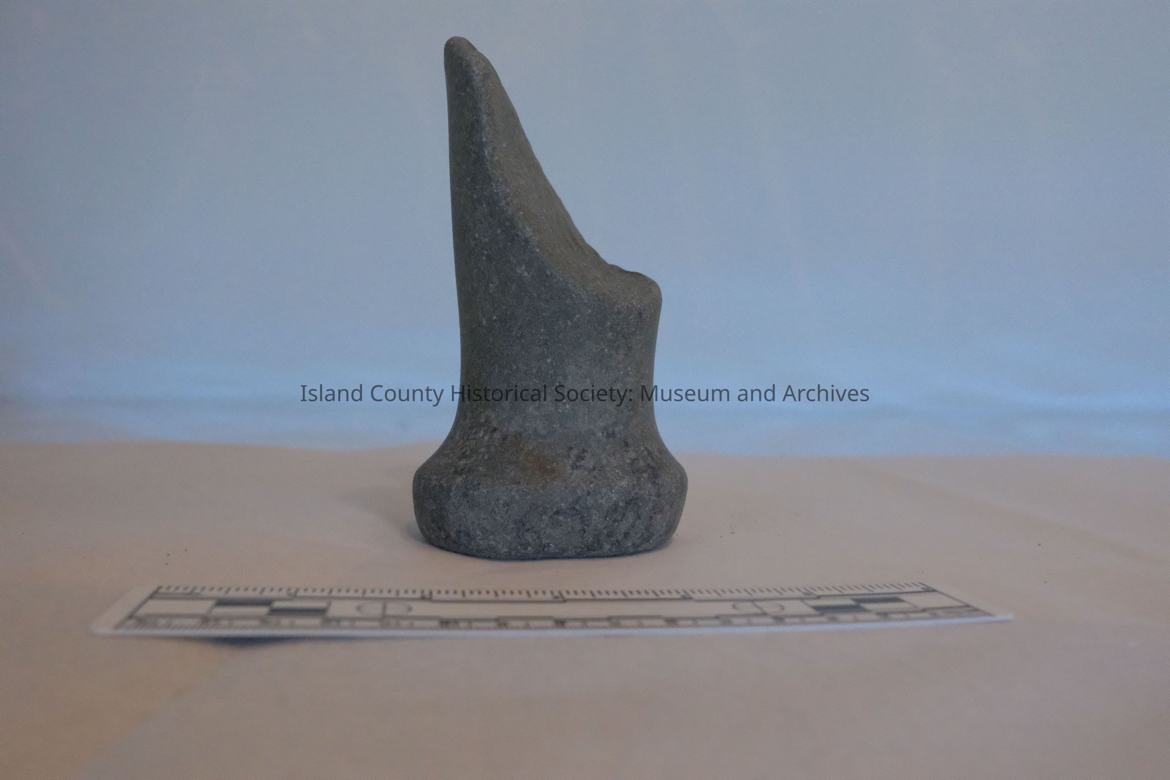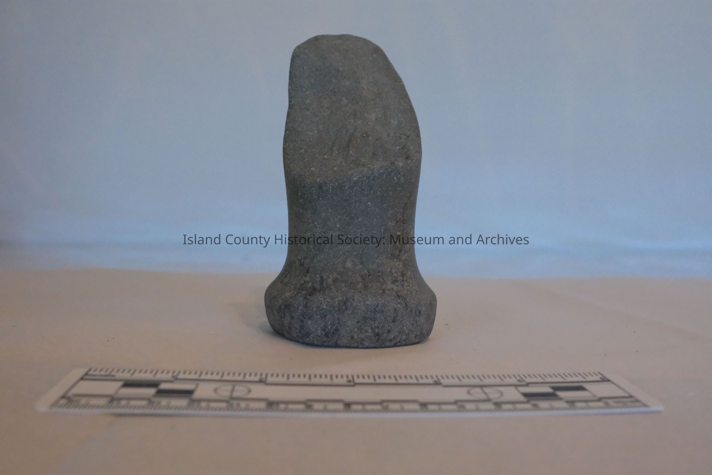 Stone maul. Broken at an angle at handle/top. Bottom is flat & worked smooth. Found off Whidbey Island - 315 Harrington Road, east side of island near Race Lagoon. Donated by Stuart Gullstrand.