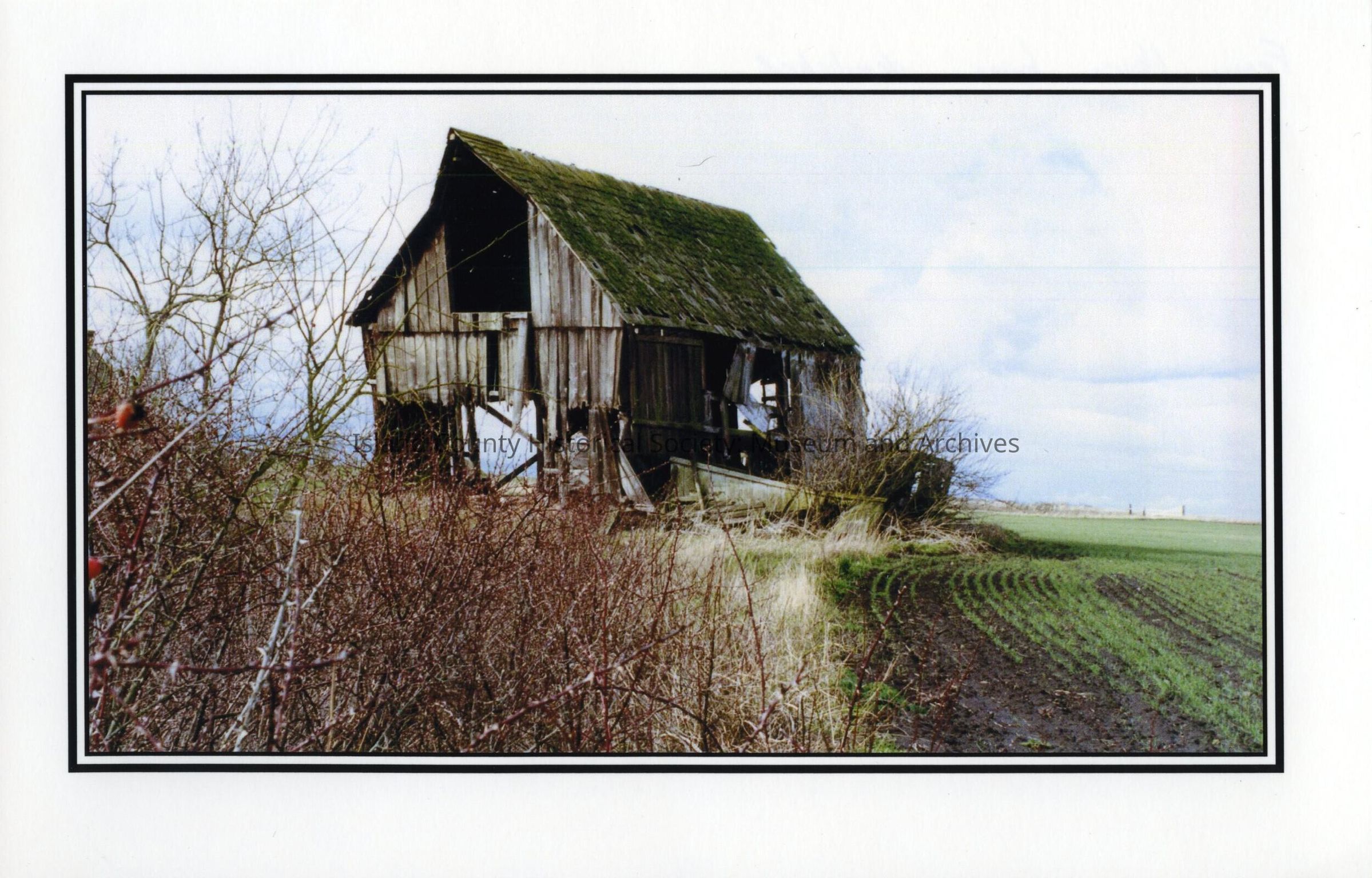 Reverse says "Ferry House barn - demolished". View is south across Admiralty's Inlet. Barn located on Ebey's Prairie near cultivated fields.