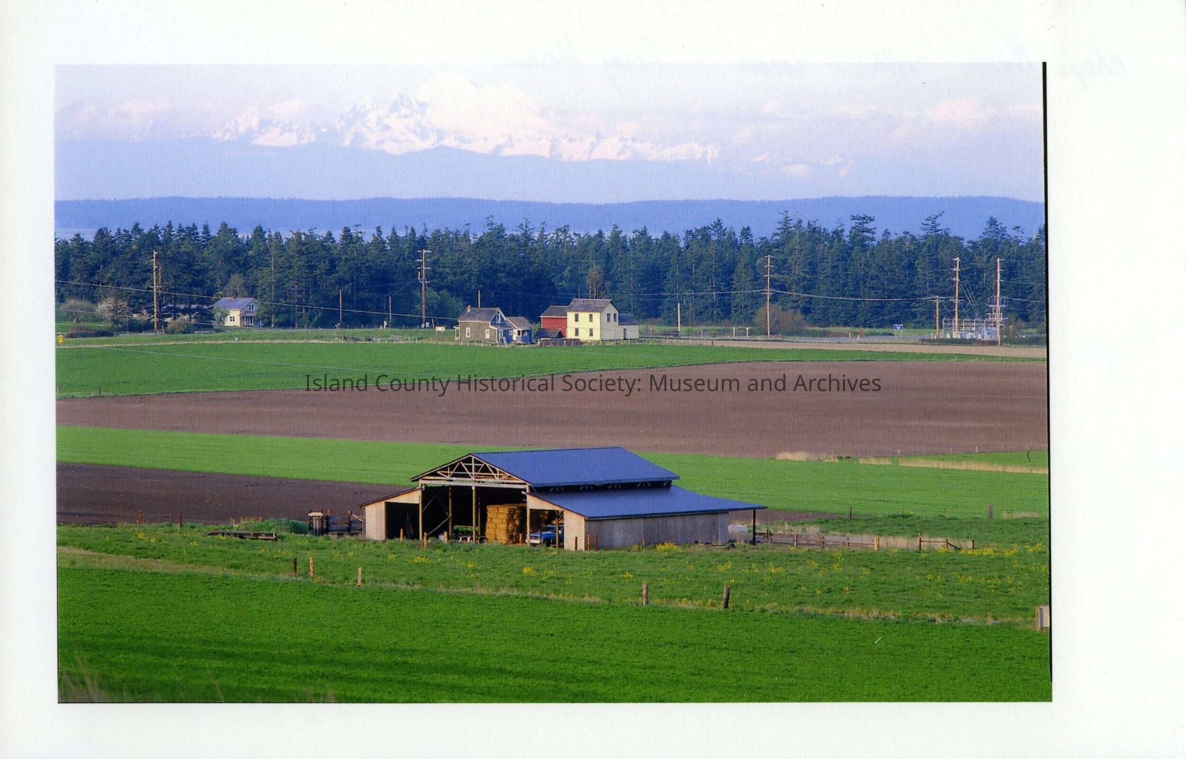 Reverse side of photo shows "Ebey's Prairie - northeast corner Terry House". Cascade Mountains are in the background. Penn Cove and more of Whidbey Island are visible between the trees and the Cascade Mountains. The yellow/cream-colored house is the Terry House.