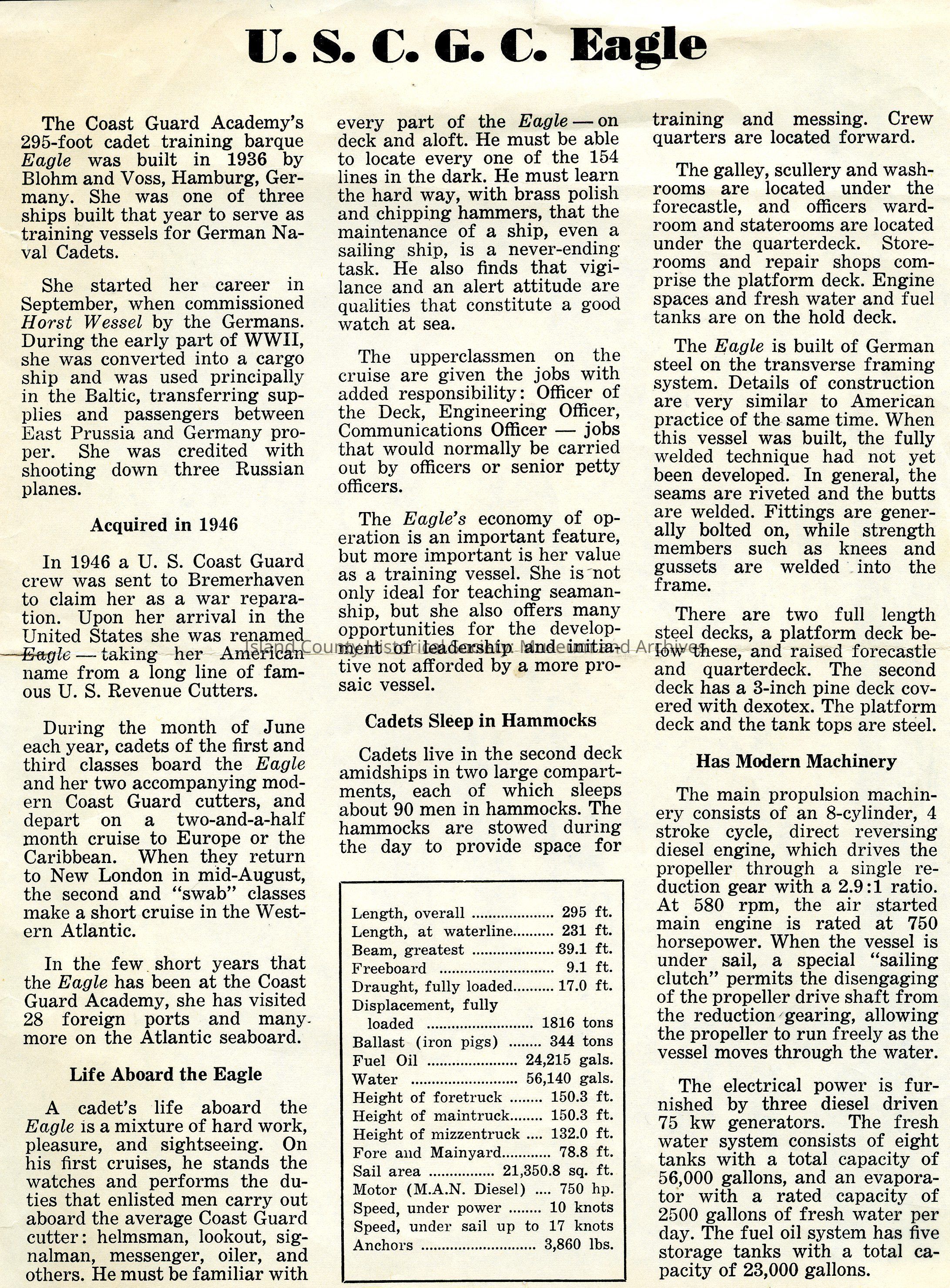 B/W photo of Eagle, as well as history of and details on the ship