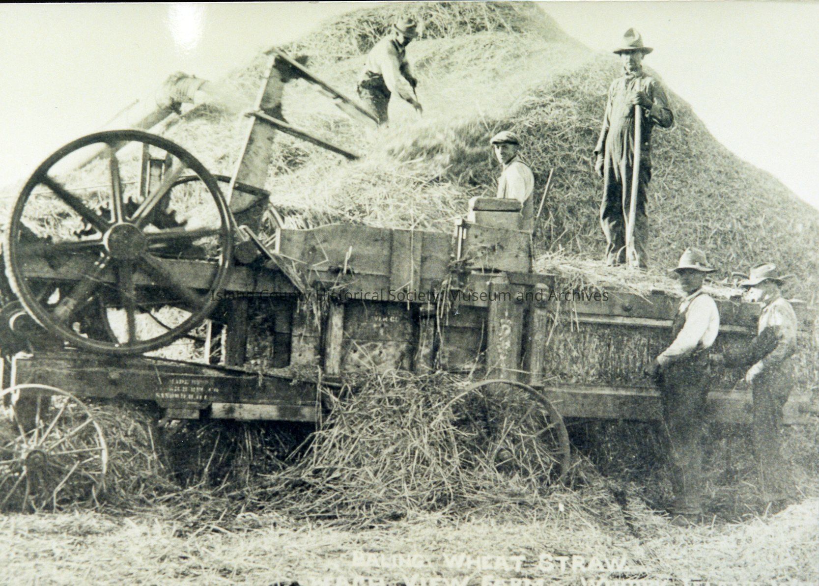 Postcard depicting the baling of wheat straw using a stationary baler at Beach View Farm in Oak Harbor, c. 1900-1920.