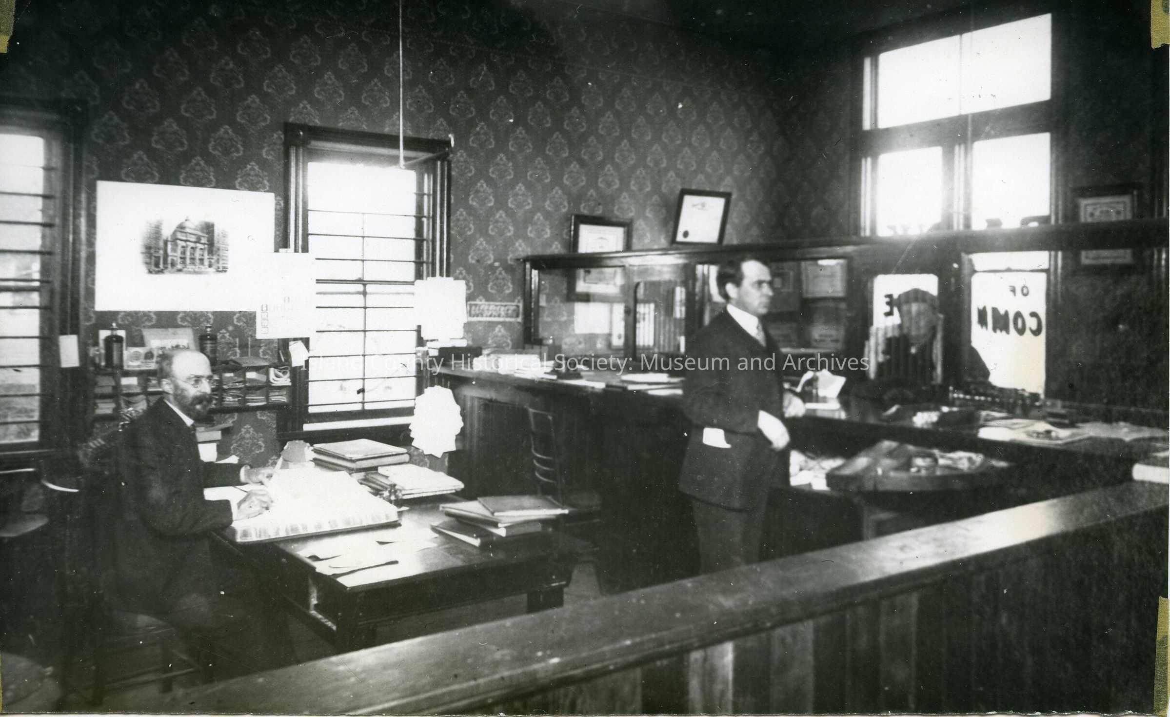 Photo of two men in a bank behind the counter, and a woman at the teller window. On the back: Interier of the Bank of Commerce - Coupeville - seated: J.B. Libbey, at window: Keturah Coupe Gillespie. Photo taken 1904.