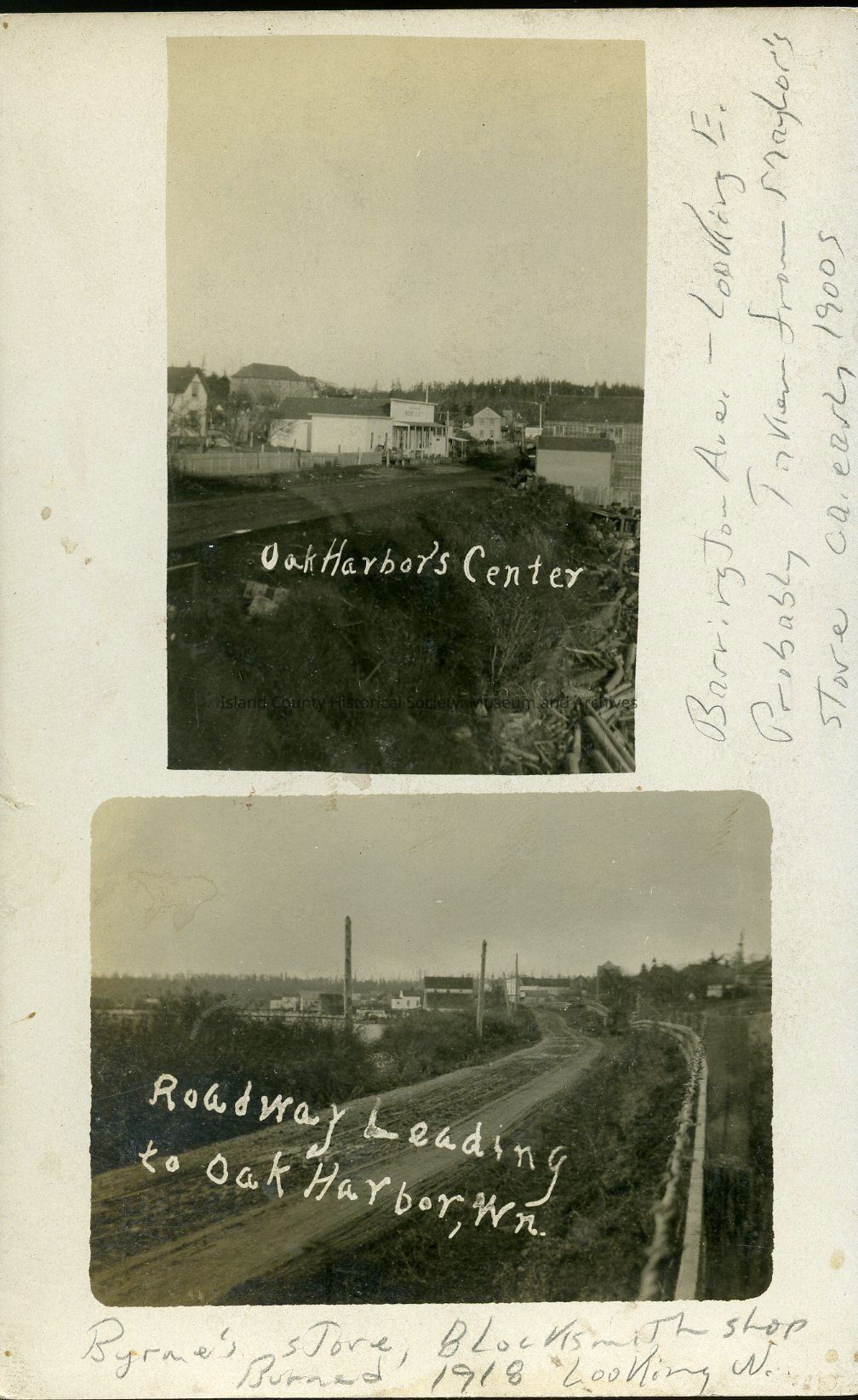 Postcard depicting a view of Barrington Avenue (top) and the road to Oak Harbor (bottom). Handwritten note by Roger Sherman at top reads, "Barrington Ave - Looking E.[East] Probably taken from Maylor's store ca. early 1900s."