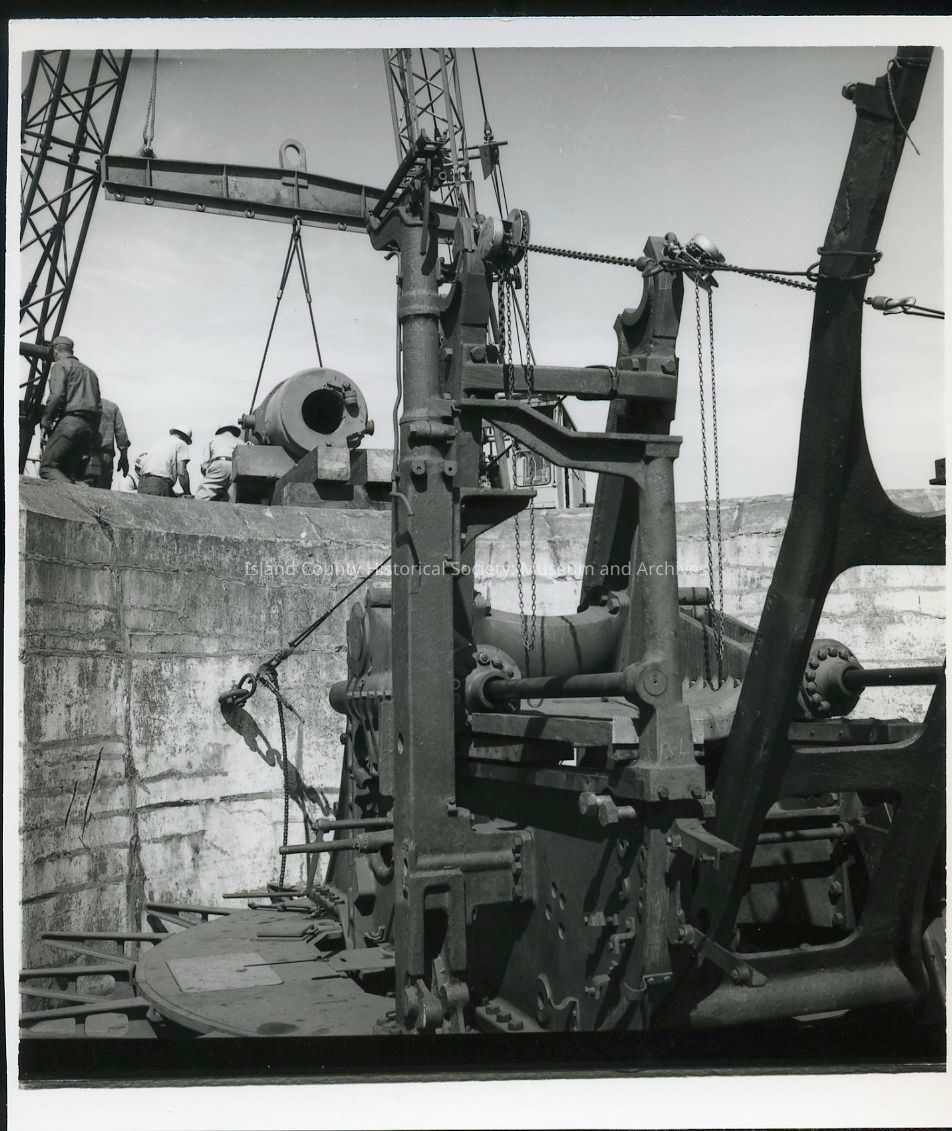 Photograph of Battery Worth at Fort Casey. The guns were brought from Fort Wint in the Philippines. The barrel pictured is being mounted by a volunteer from Bremerton, c. 1967. Battery Worth was designed to protect the Puget Sound from naval threats.Photograph Details