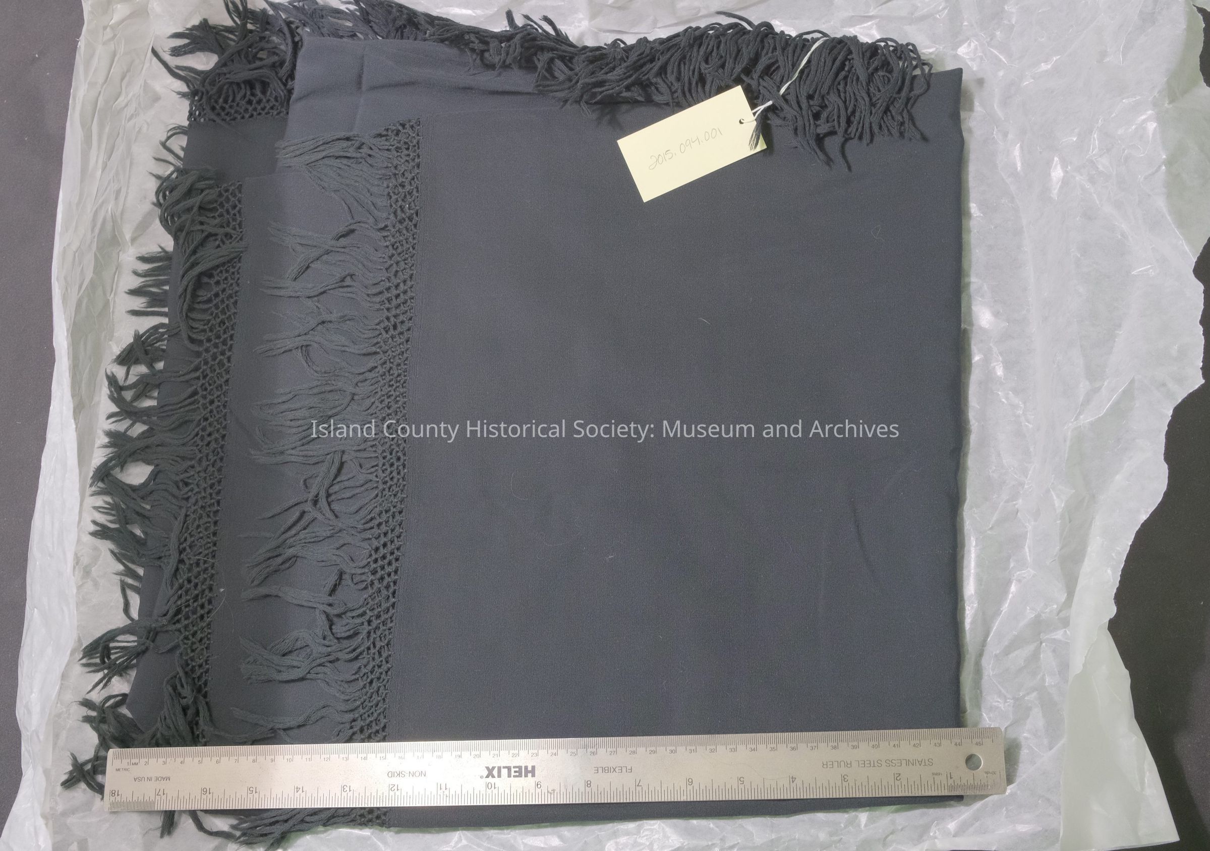 Black Homespun cloth by Mary A. Lesourd's mother before 1859. Woven by a traveling weaver. Exhibited by Dorothy LeSourd Sherman, Coupeville.