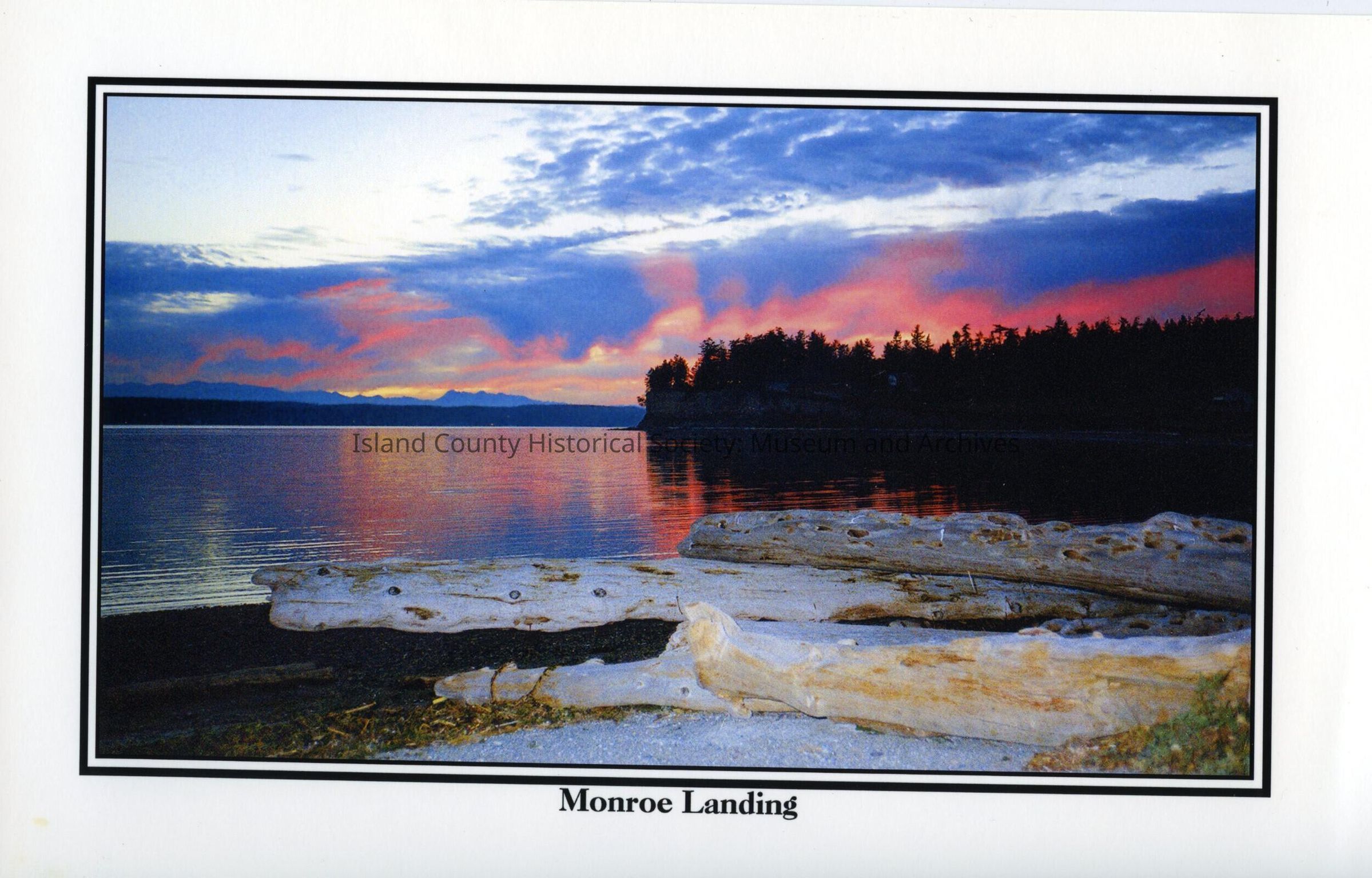 Photo caption is "Monroe Landing". View is southwest, towards the end of Penn Cove. The Olympic Mountains show on the distant skyline. Coupeville can't be seen, but is on the shore across Penn Cove to the left.