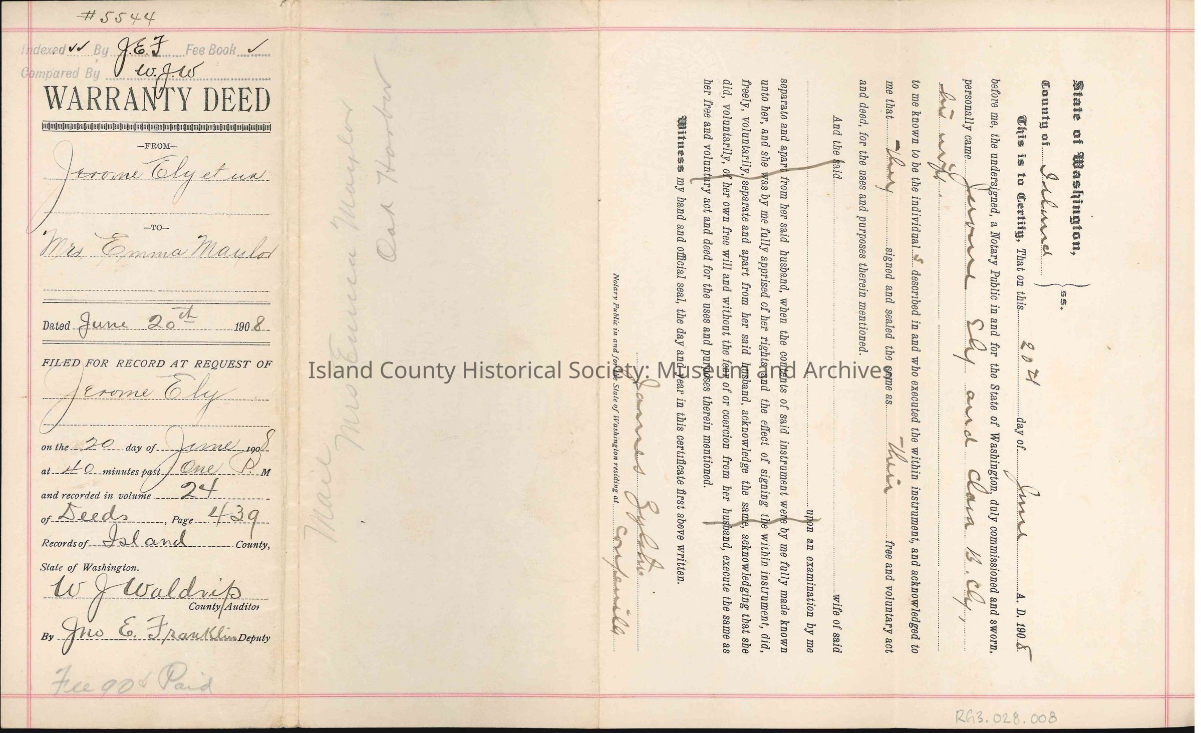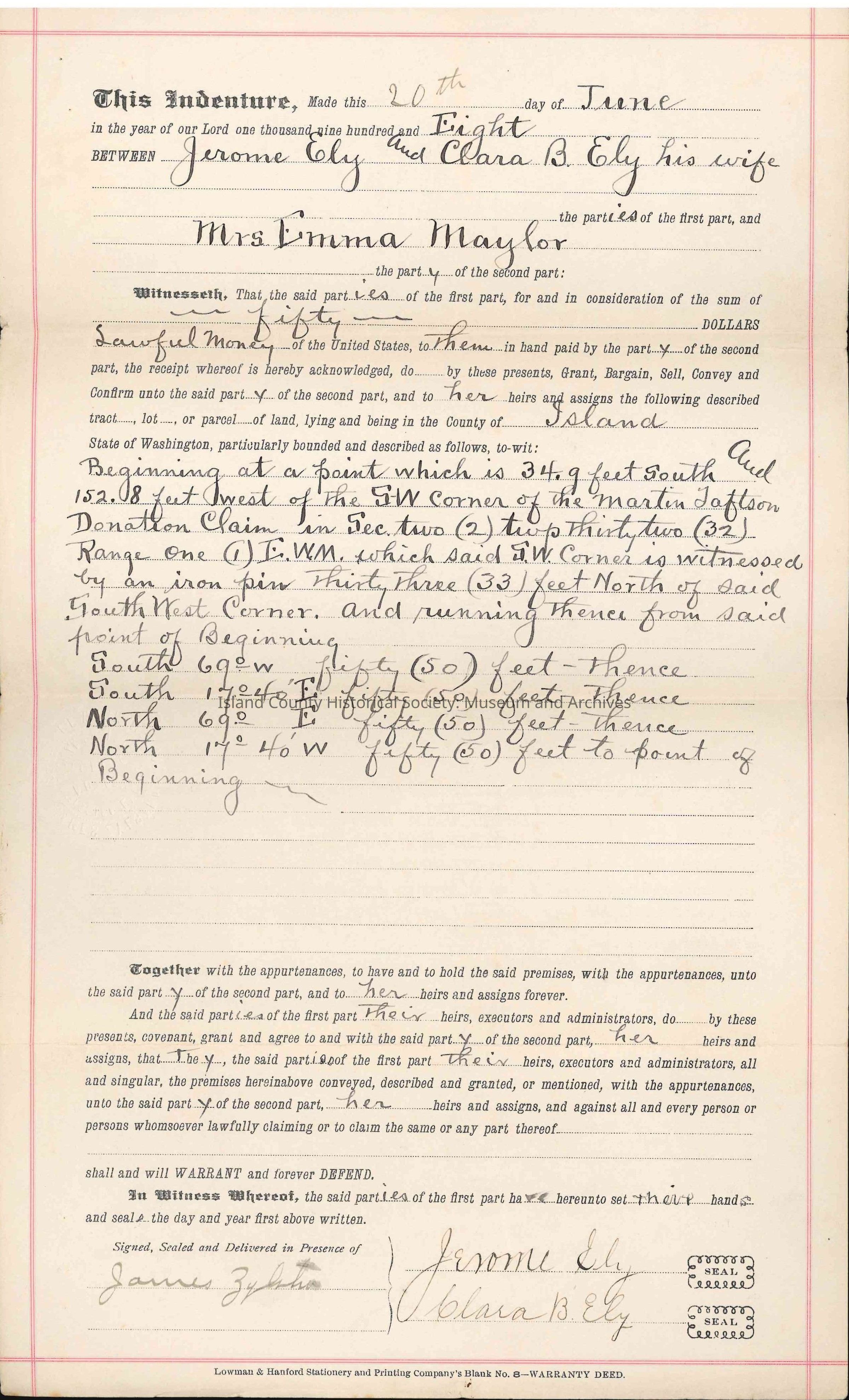Warranty Deed from Jerome Ely et al to Mrs. Emma Maylor, c. 20 June 1908.