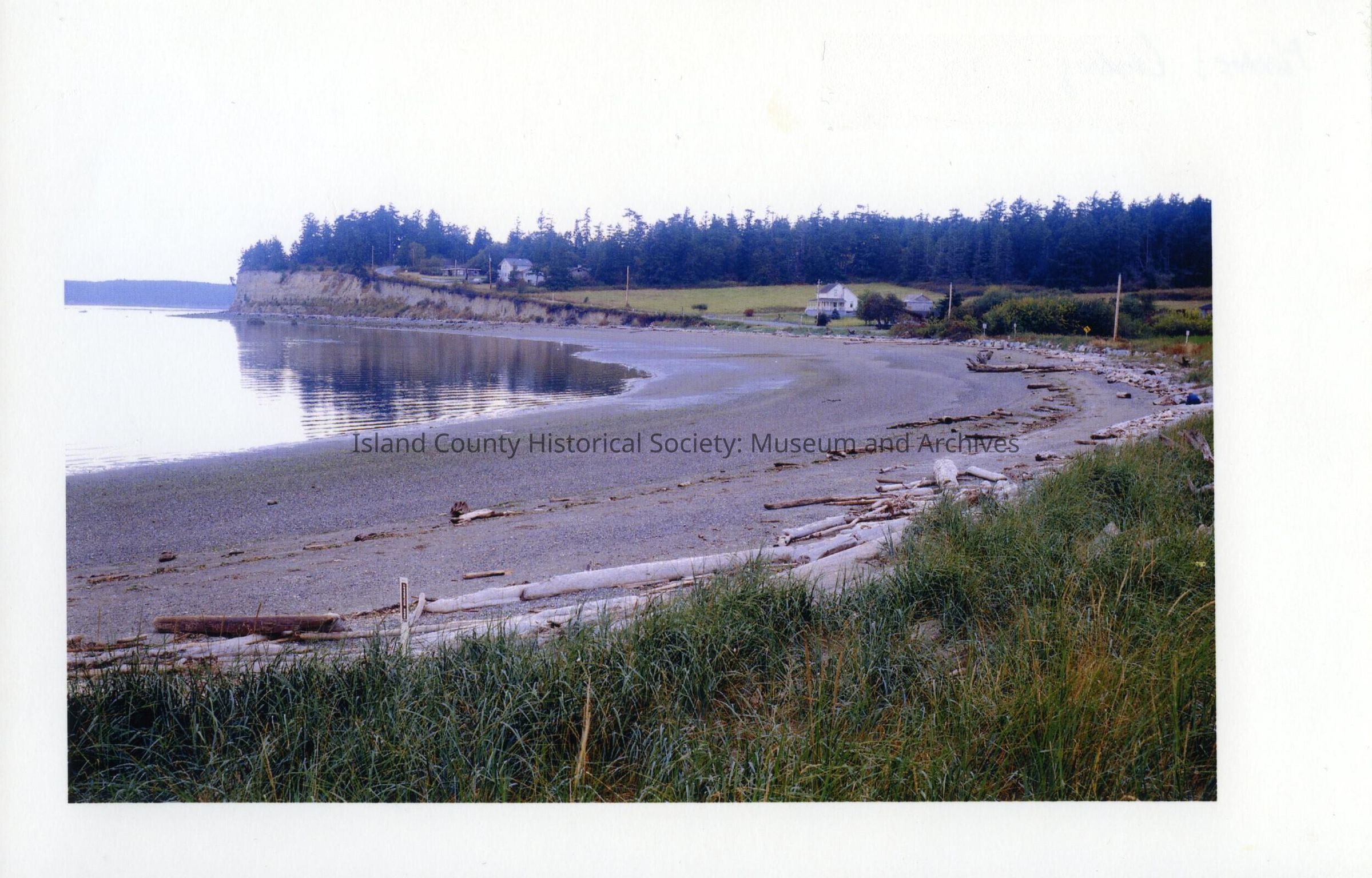 Reverse side is titled "Monroe's Landing". View looks west from Monroe's Landing, along Penn Cove shoreline and bluff.