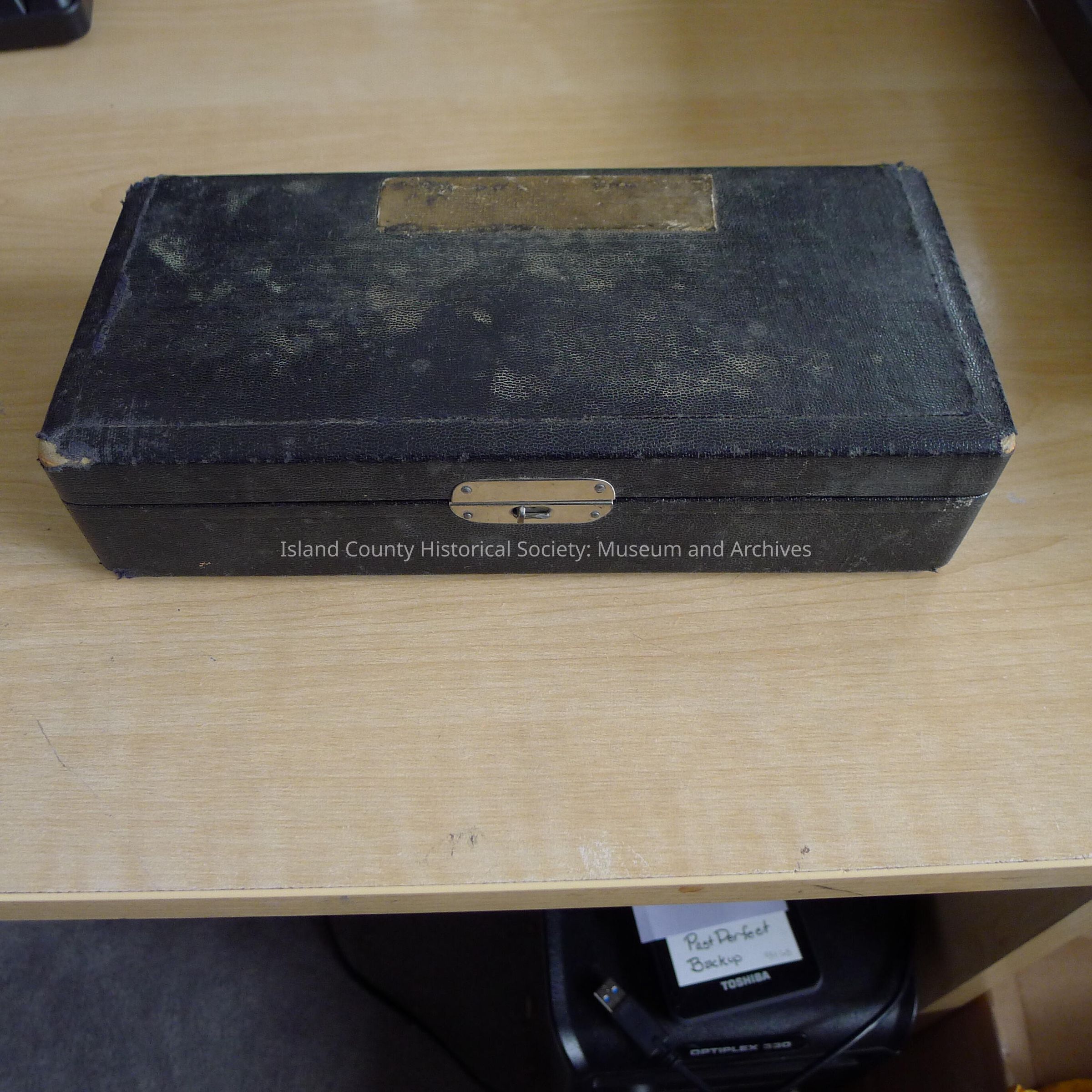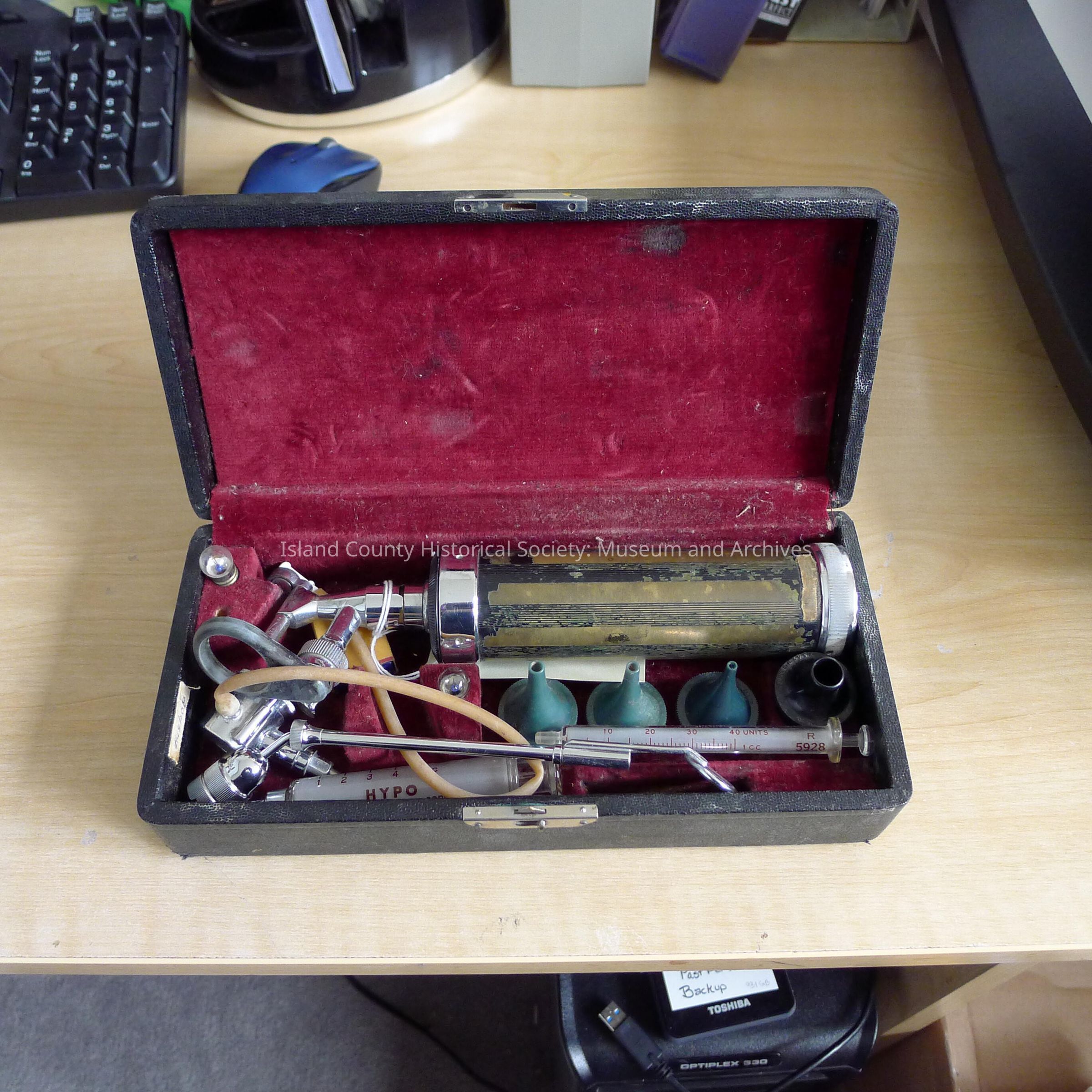 Welch Alleyn Otoscope and accompanying parts inside a oblong box with metal clasp. The box is wood covered with blackened leather (scuffed) and red felt (?) lining inside. Most of the equipment was produced by W.A.CO.AUBURN, N.Y.