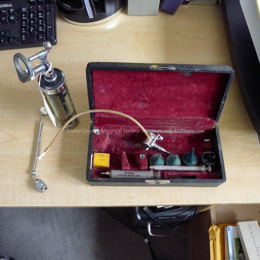 2 little light bulbs. Another lens piece of metal and glass with metal nozzle and rubber piping attached, which is stoppered with a white plastic cylindrical piece with a hole through it. A mirror instrument like dentists use (circular mirror on long metal rod). This has engraved in a cross: BOILO and a 3 below it.