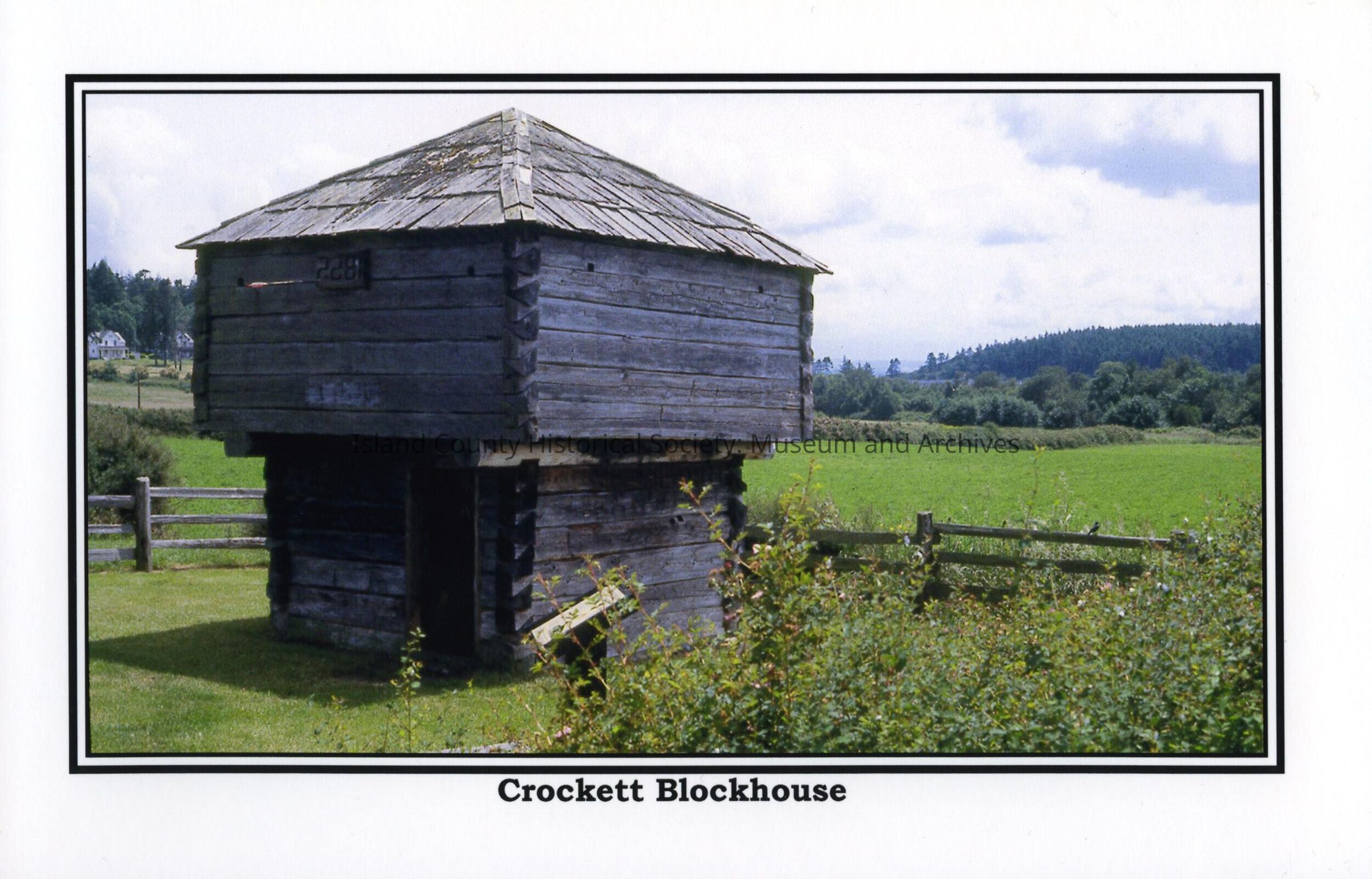 Photo is captioned "Crockett Blockhouse". View is towards south. The hill on the right side of the photo is part of Fort Casey. Crockett Lake is nearby. The homes on the left have a view of Crockett Lake.