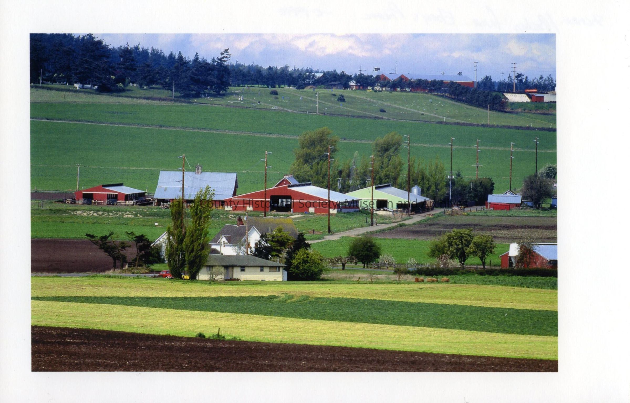 Reverse of photo shows: Sherman/Bishop Farm - Ebey's Prairie c1990 (c1990 is lined through). The view is slightly north of west. Sunnyside Cemetery is shown in the background. The fields are located in Ebey's Prairie. State Hwy 20 is to the right (north).