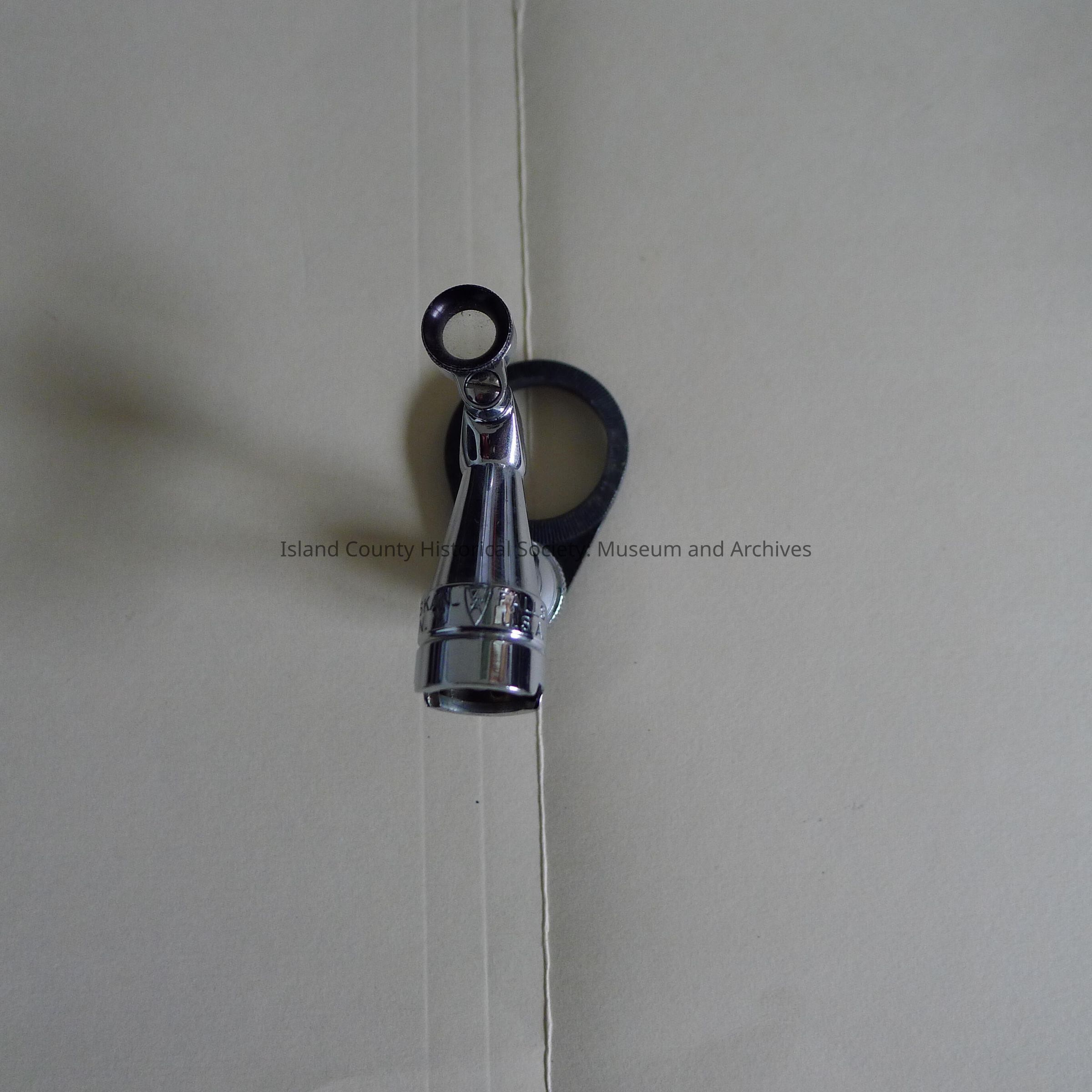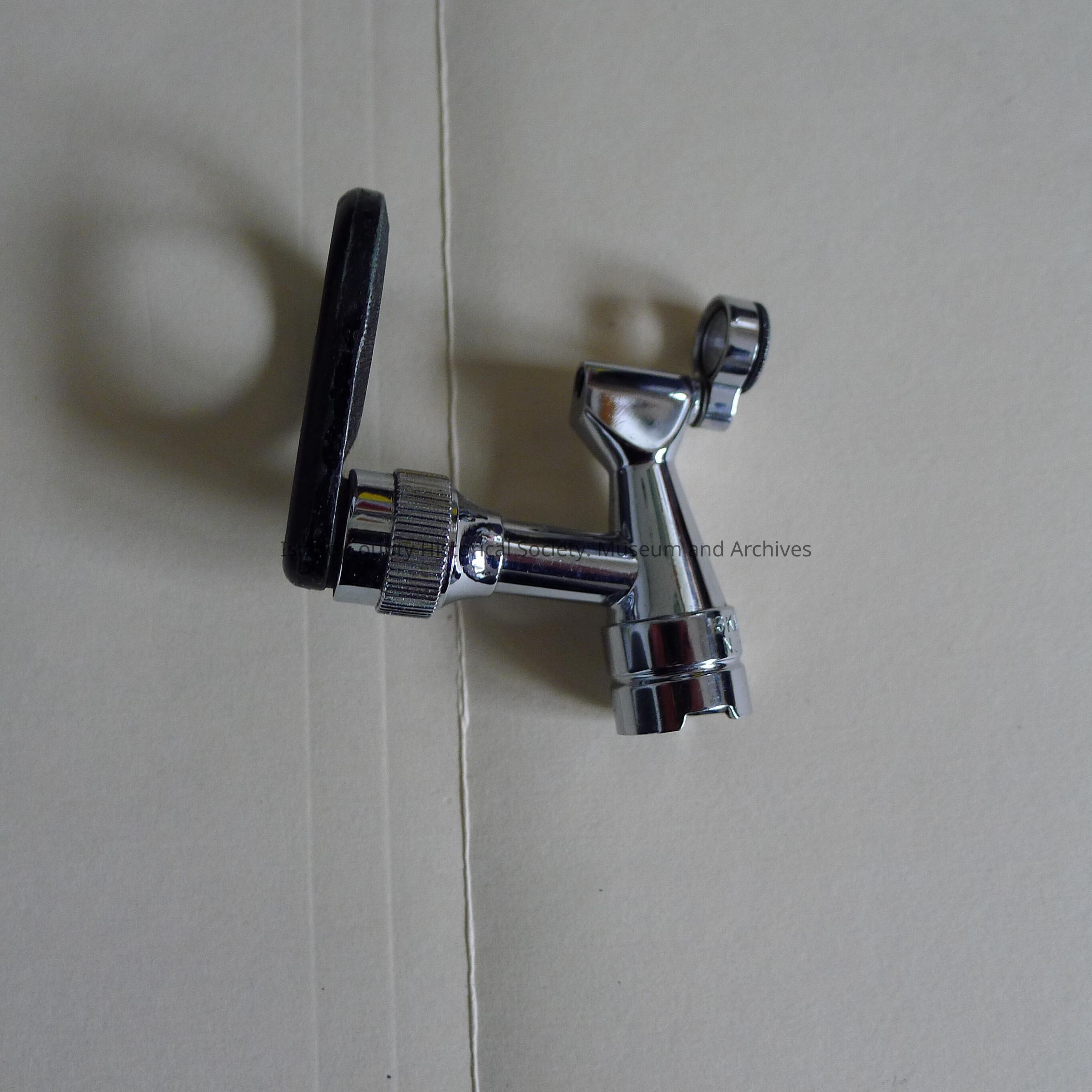 Magnifying Lens made of metal and glass. Dusty and scuffed in places, but in fair condition. Engraved: "Skan Falls N.Y. U.S.A" and a logo (upside down triangle with W at the top and then A below).