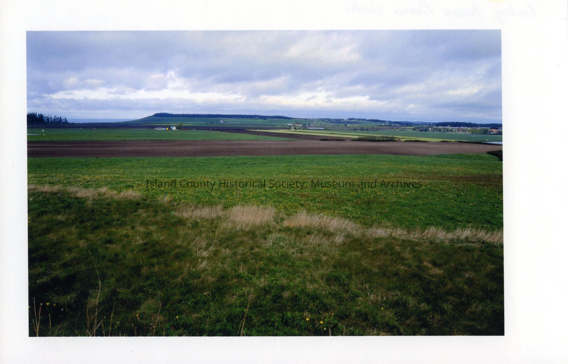 On reverse of photo: "Looking toward Prairie Center". View is of Ebey's Prairie. In the distance at left, one can see the Olympic Peninsula, across the Puget Sound. To the right of the Olympic Peninsula is Ebey's Bluff and a forested area. In front of the forested area at the right is Sunnyside Cemetery