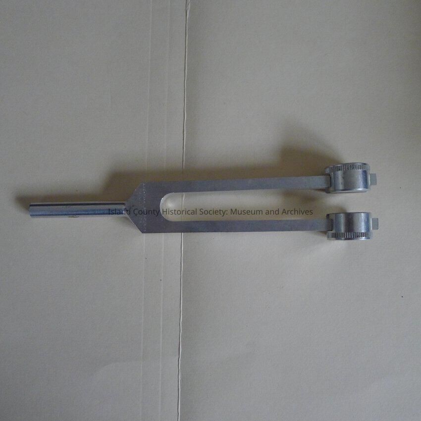 Instrument that looks like a tuning fork, but may be something else entirely. Handle with two prongs and each prong end has a cylinder attached. Scratched and tarnished but fair condition. Inscribed in italics is "Lilly" on one side of a prong. At their join is: 256 and a C below. At the join on the other side: "Riverbank Laboratories, Geneva, Illinois"