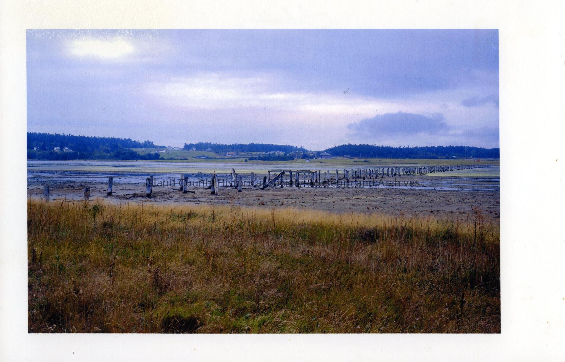 Reverse of photo: "Train Trestle Remains at Crockett Lake." and "February". This is likely the trestle that transported farm products. The Crockett Barn can be seen just to the right of center. Fort Casey is located in the forested area on the left.