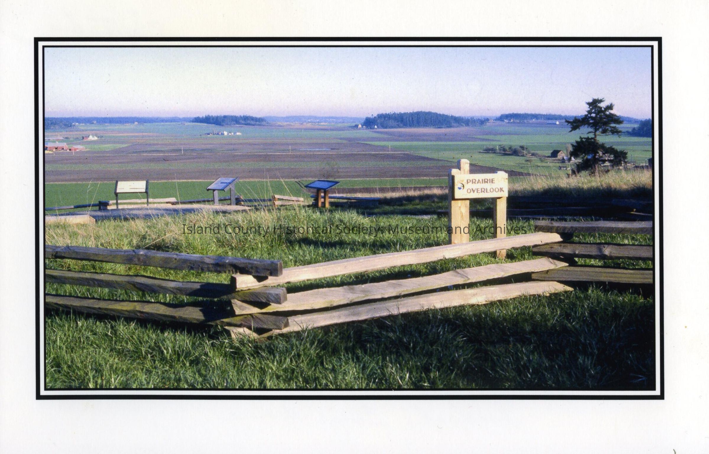 Reverse side shows: "Overlook - Ebeys Prairie" and "September". This panoramic view facing east shows much of Ebey's Prairie from the Prairie Overlook near Sunnyside Cemetery. On the left side, one finds the red barns of the Sherman-Bishop farm. The Jenne Farm is located on the right of center, just in front of a forested area. To the left of the Jenne Farm, the prominent white buildings are the Hancock Farm.Lexicon