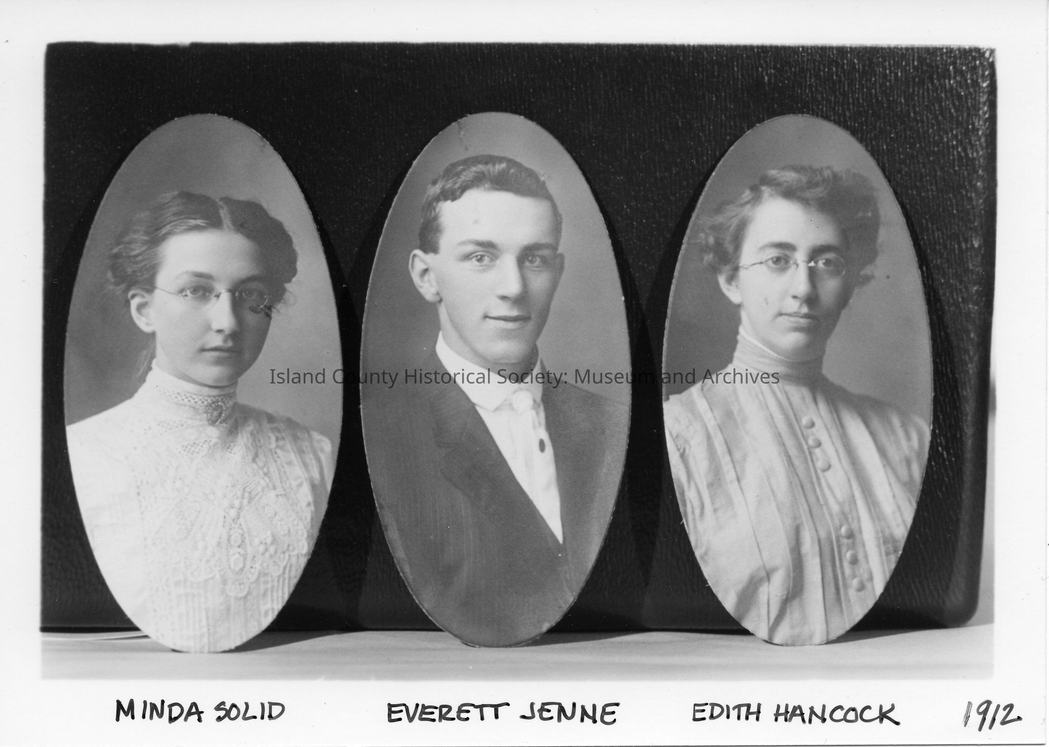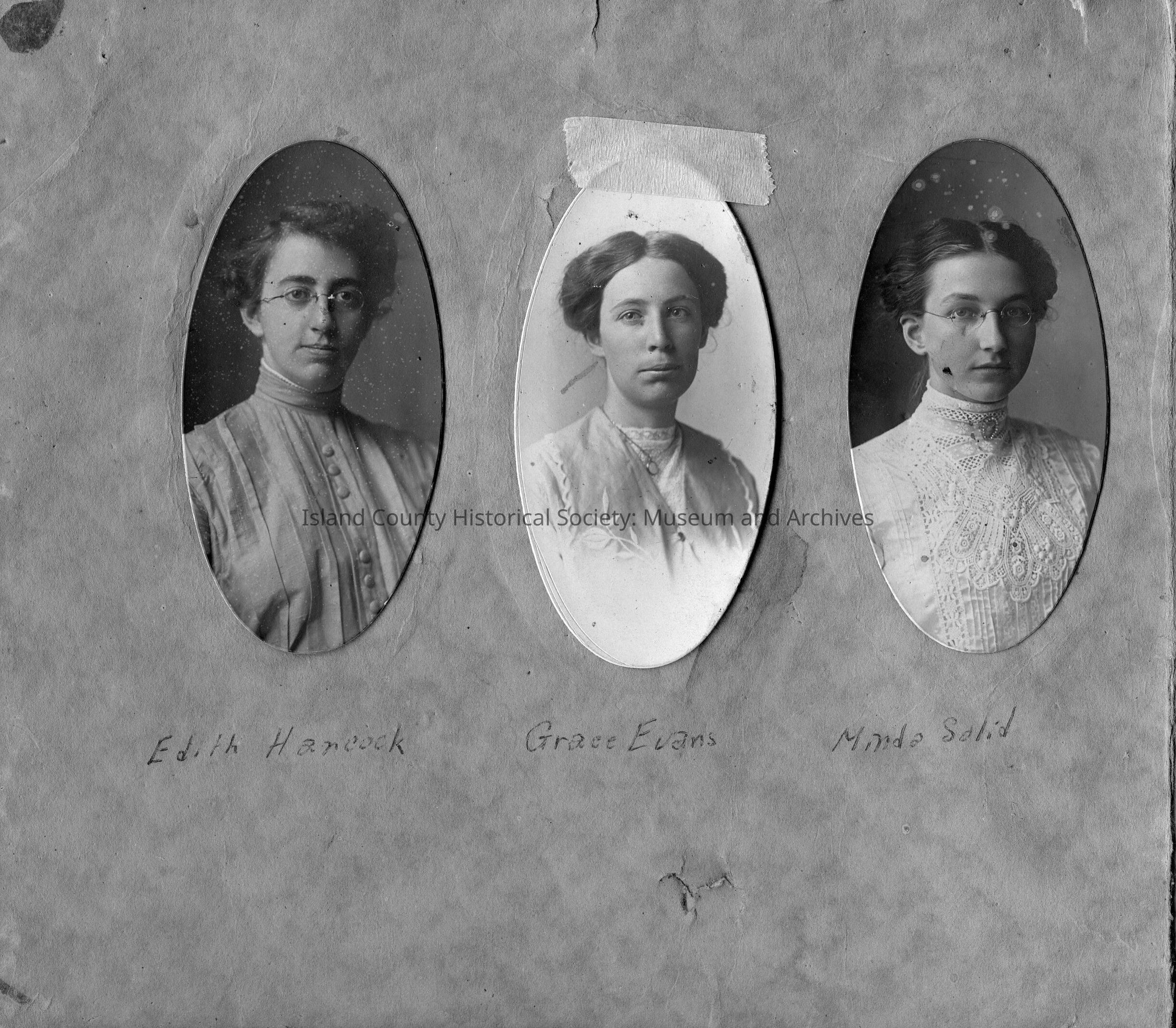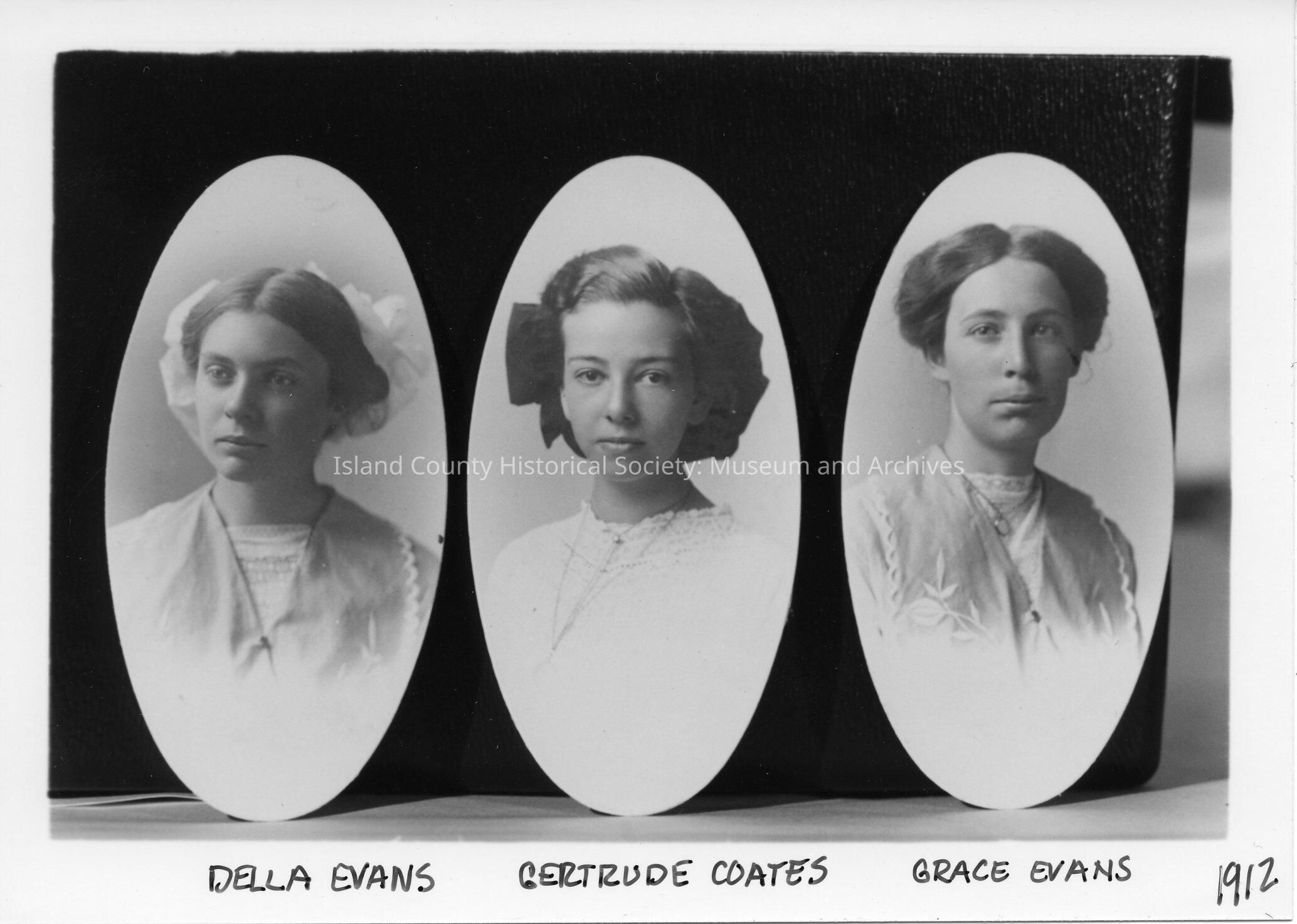 Three oval student portraits. Coupeville High School Class of 1912. Della Evans, Gertrude Coates, Grace Evans.Lexicon