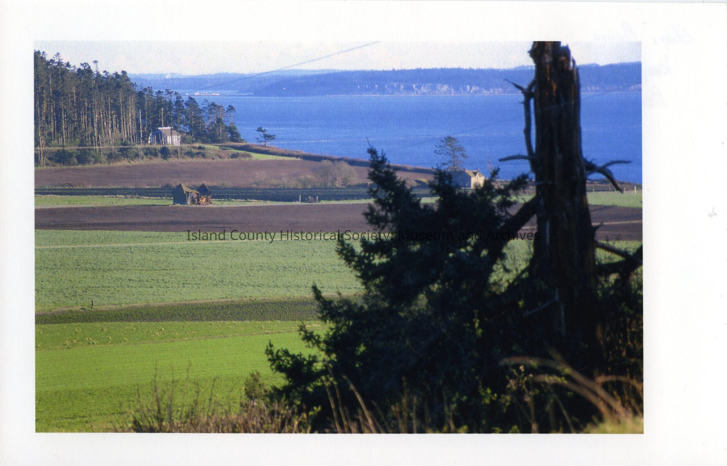 Reverse of photo: "Ebey's Prairie. Ferry House (R center); Rundy (sp?) house above barn (barn demolished)". Southern portion of Ebey's Prairie ends in small bluff at Ebey's Landing and the Puget Sound. Across the Puget Sound is Marrowstone Island