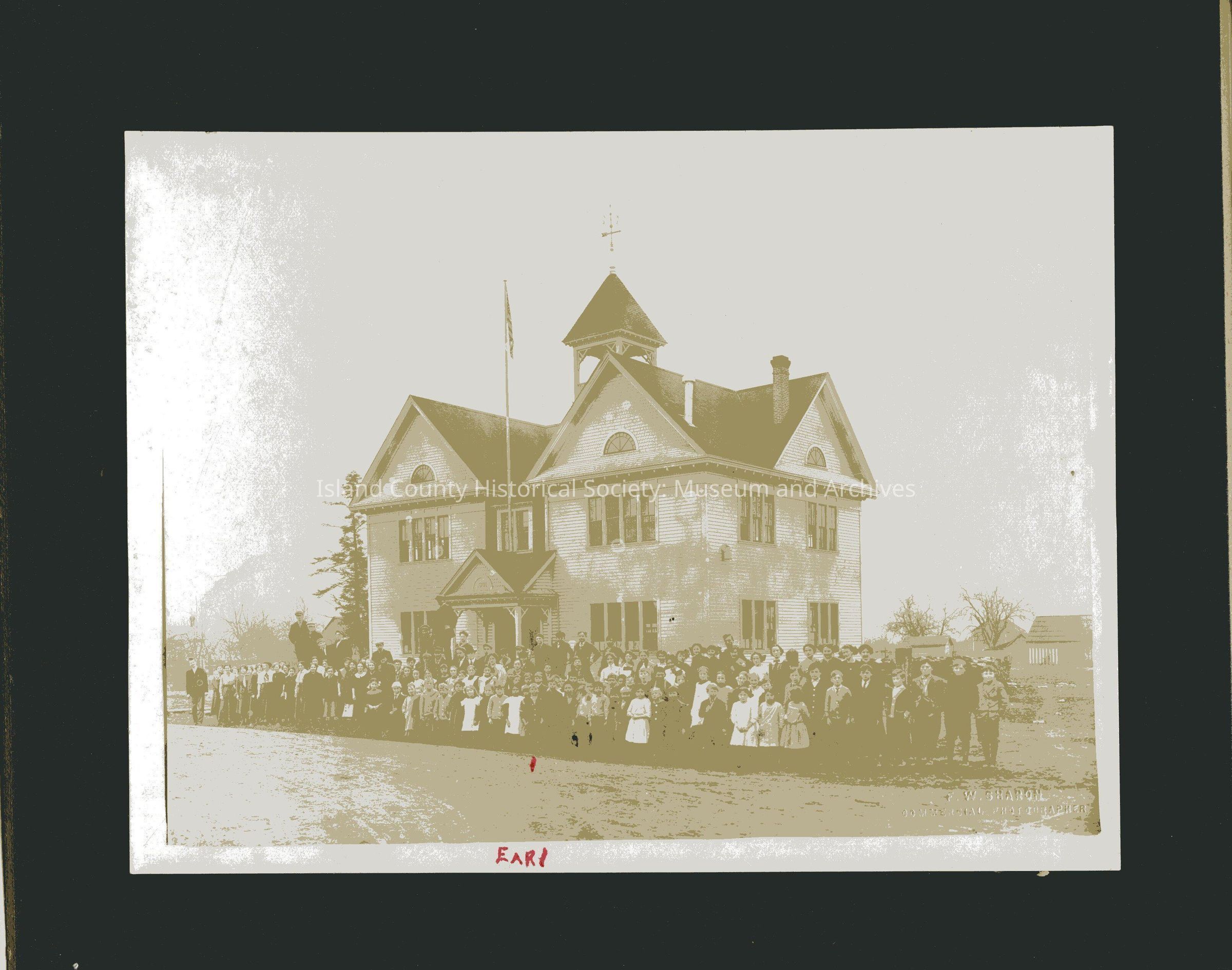 Children and teachers of Coupeville Elementary and High School in front of building, 1912-1913. Note on front points to "Earl."