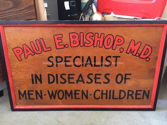 Wooden business sign. Painted in black & red on wood grain with beveled boarder. Hung outside Dr. Bishops medical office in Coupeville.