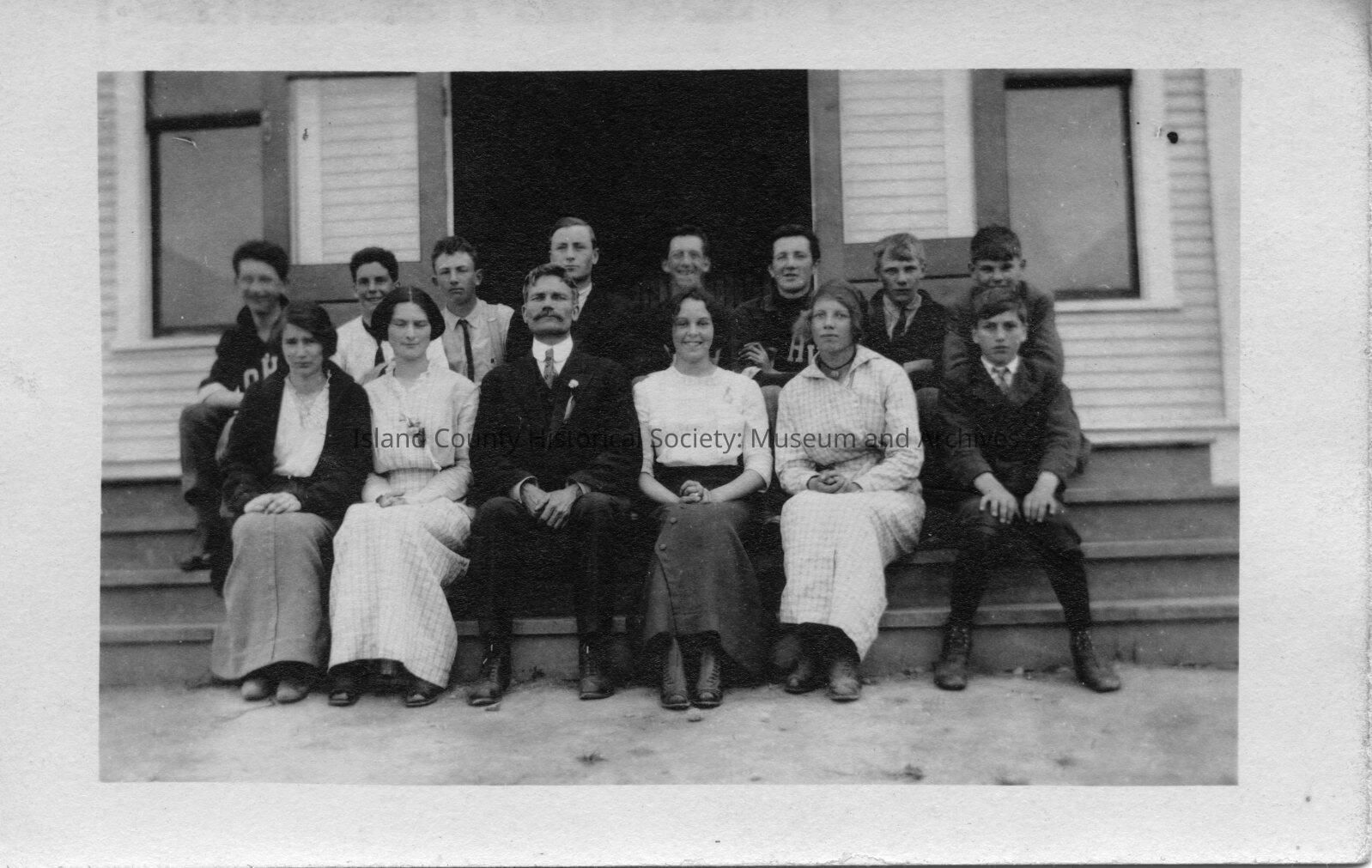 Coupeville High School class and teachers sitting on the steps of the school. Message on back reads: Dear Lillian [Lillian Monroe Kennedy, Front Row, Left]; A little remembrance of our year's work together. May 22, 1914. C.L. Hultgren.
