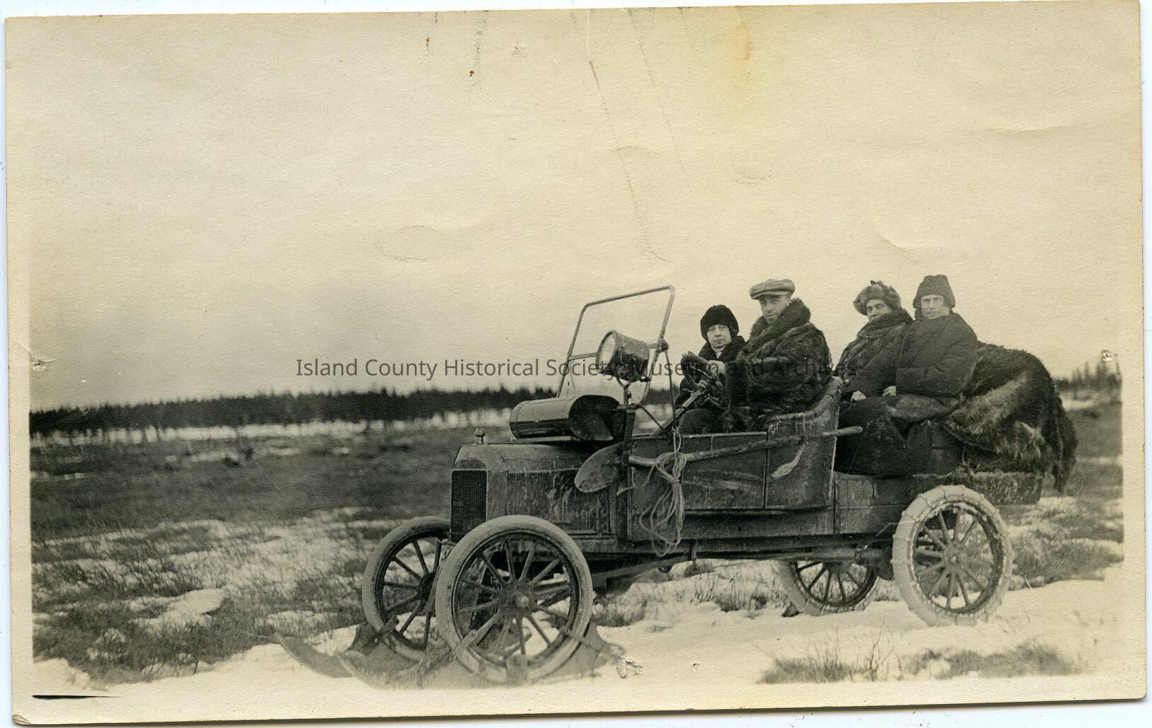 Photo of four people in an open car in snow. They are all bundled up in large coats, hats, furs.