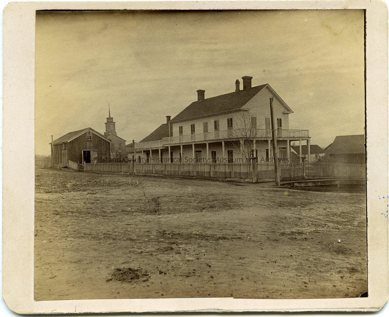 Photo of a long two-story building with a wrap-around porch and balcony, several chimneys. Barn on the left. Church in the background. Picket fence around the house and barn. Looks like a wood plank sidewalk around as well, and slightly raised on the right.
