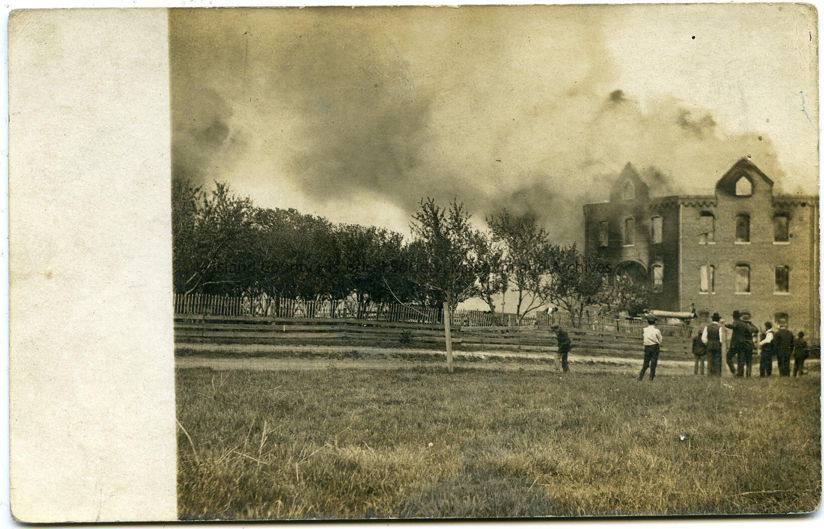 Postcard of a large two-story brick building on fire. Smoke billowing - no roof visible. Looks like it is completely gutted. Men standing in the foreground watching, another man climbing over the fence in the center.