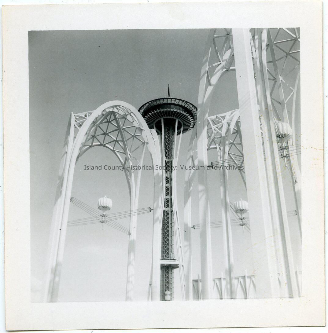 Photo of the Seattle Space Needle looking up from the base. Other metal structures - arches - part of the US Science Exhibit are also in the photo. From the folder: Washington State History - Seattle