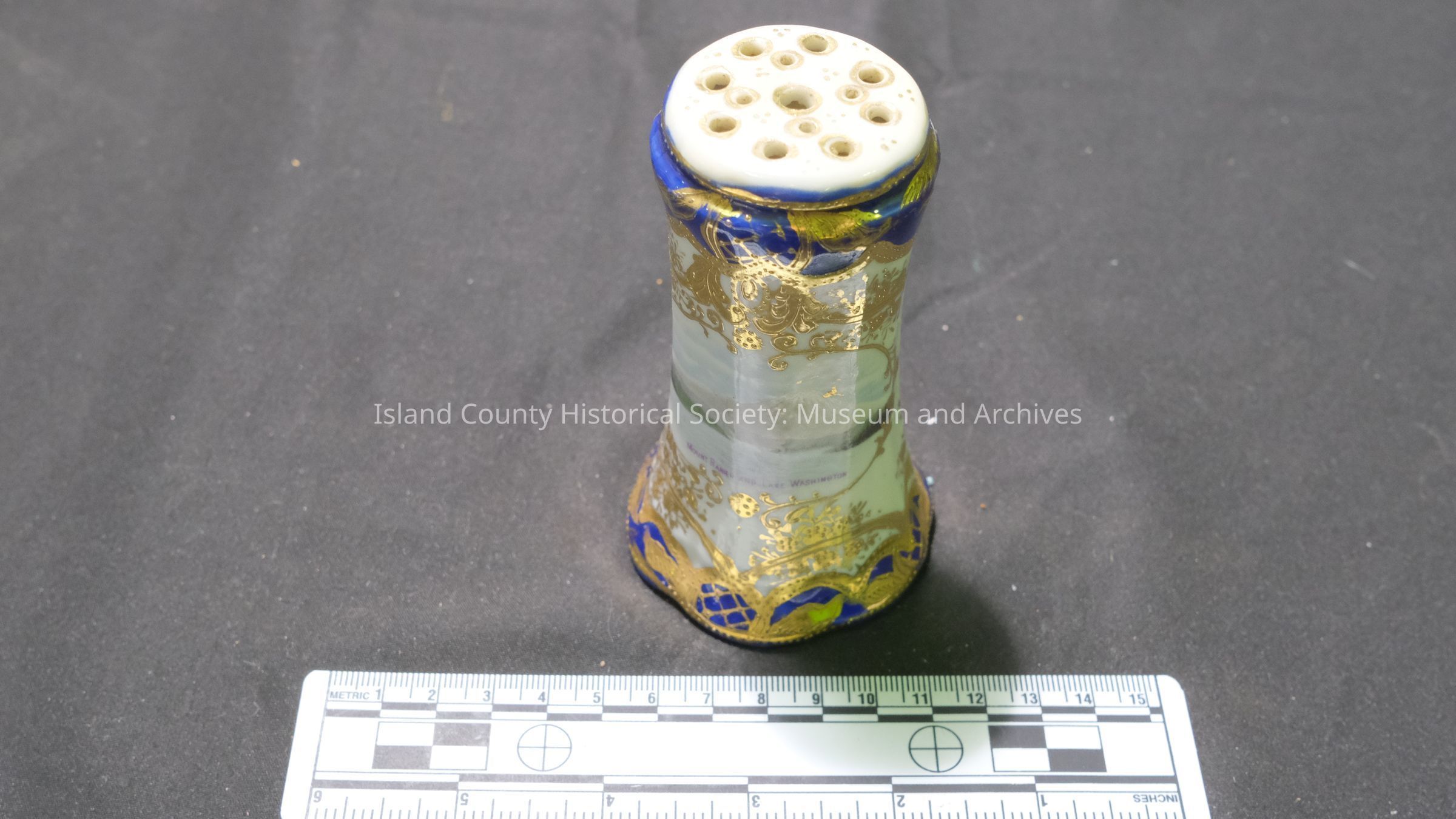 Nippon hatpin holder. blue & gold with picture of Mt. Rainier and Lake Washington. Used by Ruby Hancock.