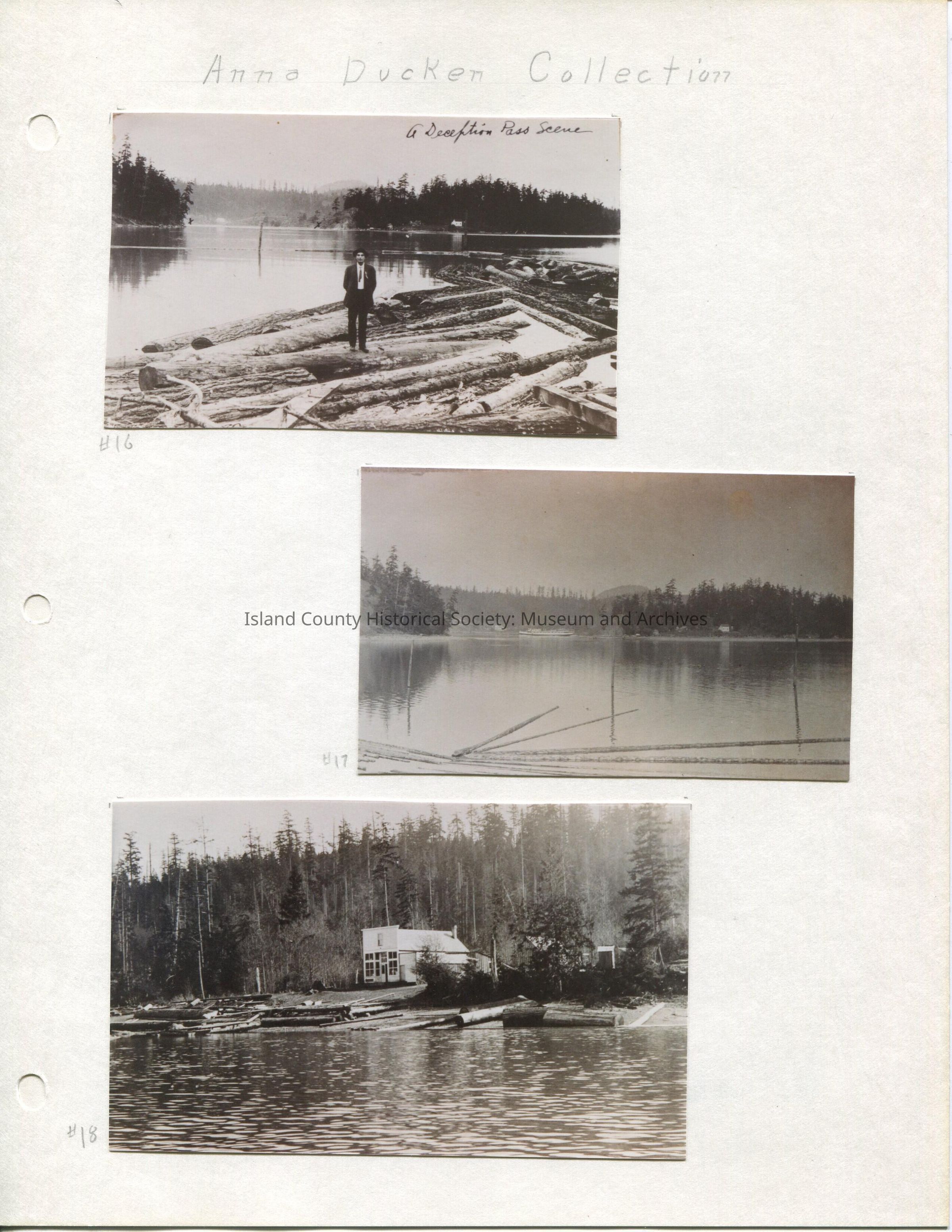 Top Photo - 4.5"W x 2.75"H - Photo of a man dressed in a suit, white shirt, tie, and wearing a hat. He is standing on a log with many logs around him. The water is behind him with trees on the distant shore. Written on the picture: "a Deception Pass scene" No date.