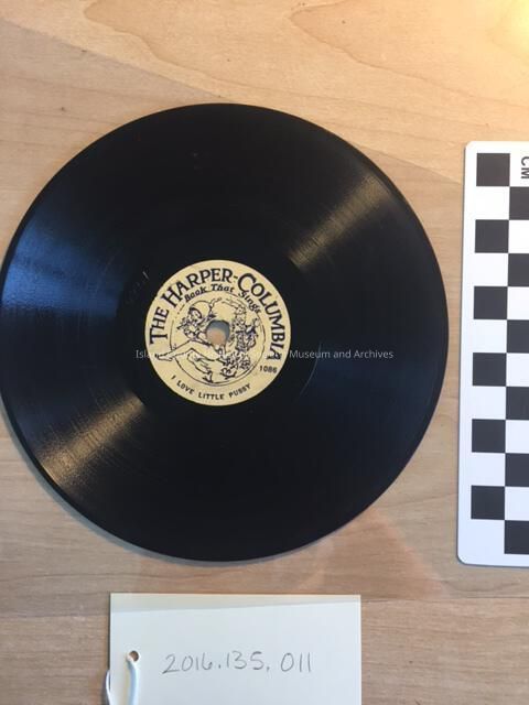A childrens music/story record. The Harper-Columbia, Book That Sings record. No. 1086. I Love Little Pussy. Arly G. Ostling's childhood playthings. Circa 1917.