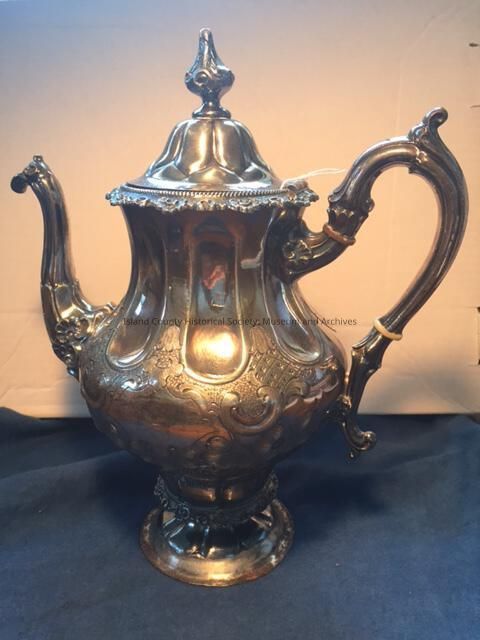 Silver coffeepot, circa 1850's, owned by Caroline Terry Kellogg who was given item as a wedding gift when she wed Dr. John Coe Kellogg in 1847. She is said to have carried it with her along the Oregon Trail in 1852 during passage to the northwest.