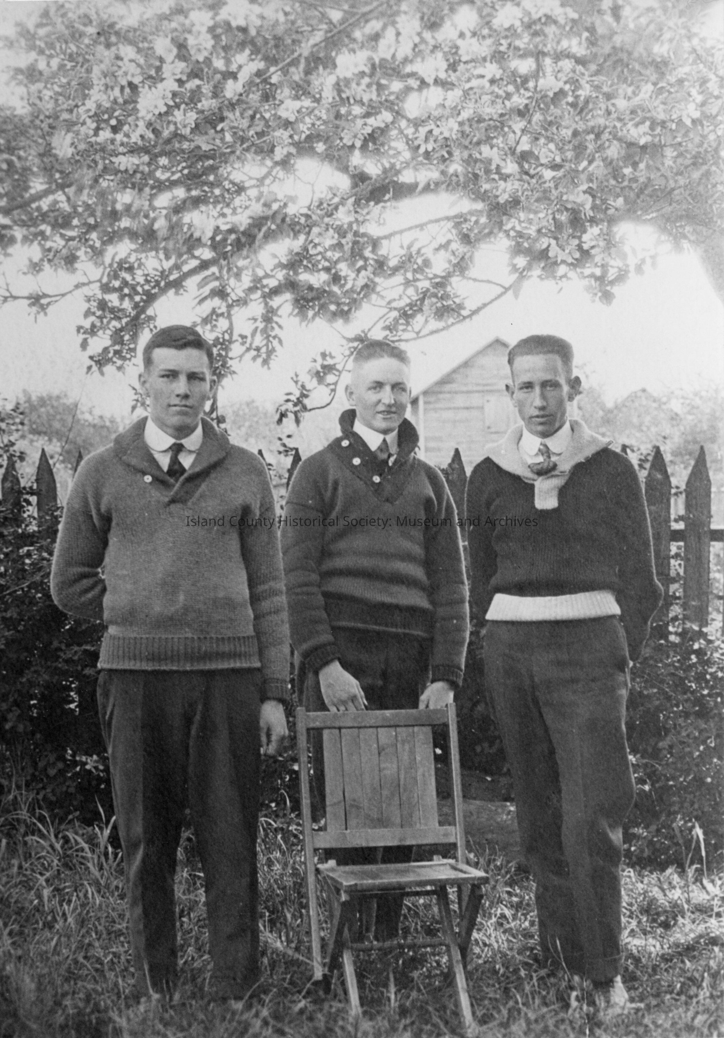 Three Coupeville High School students stand behind an empty folding chair in a garden. A barn is visible in background. Notes on back: Jenne. 1919.