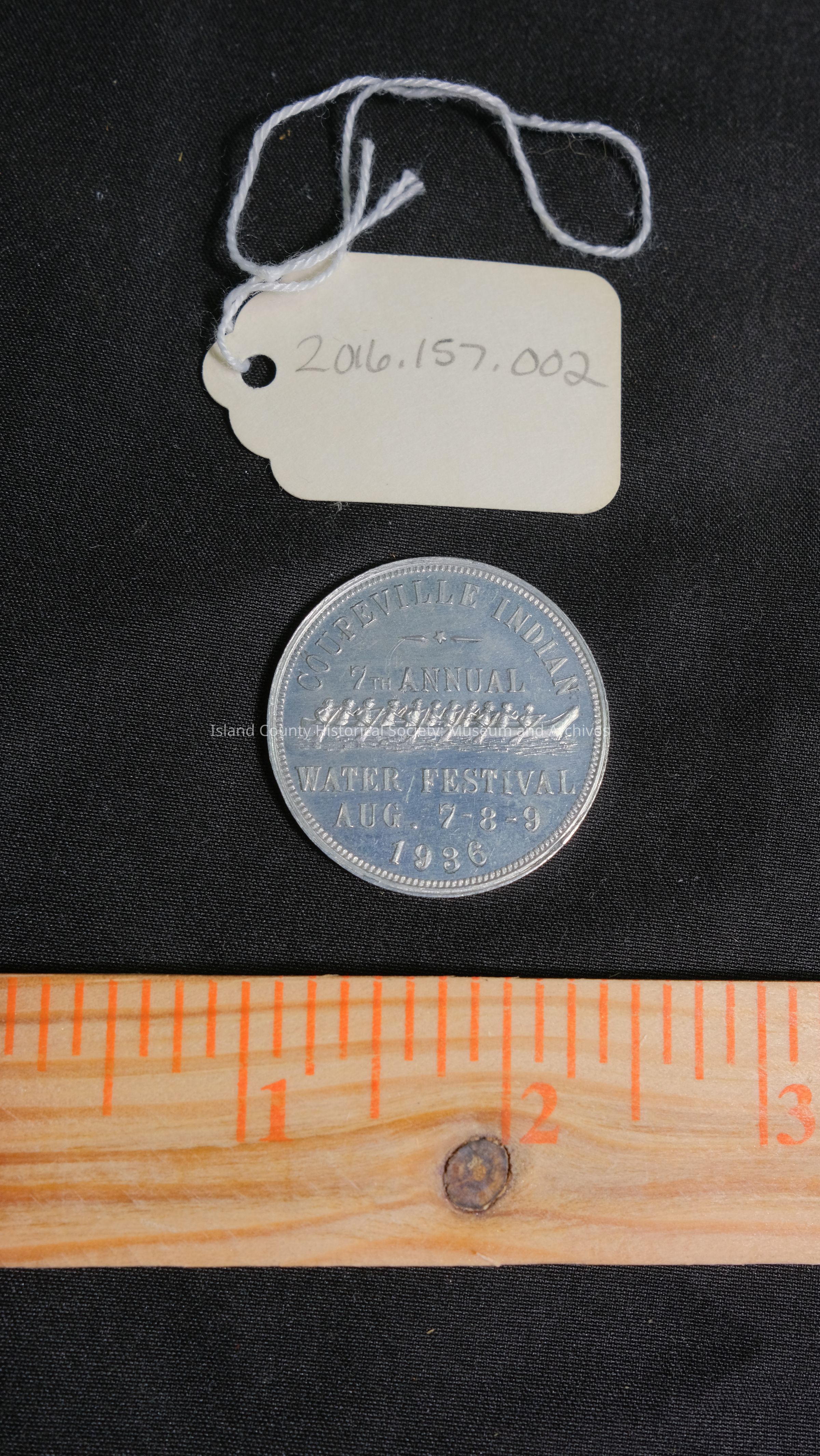 Commemerative Water Festival coin, 1936. Measures 3.5 cm diameter.