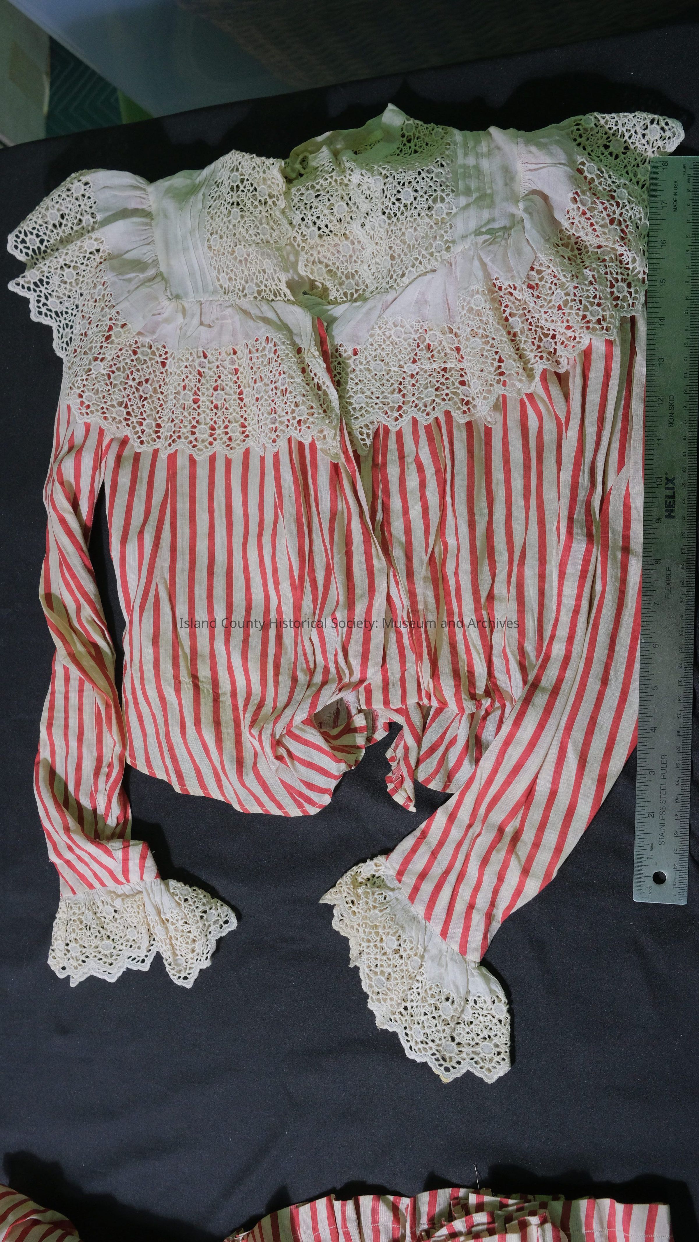 White sheer cotton lawn dress with red stripes and wide lace yoke and sleeve trim