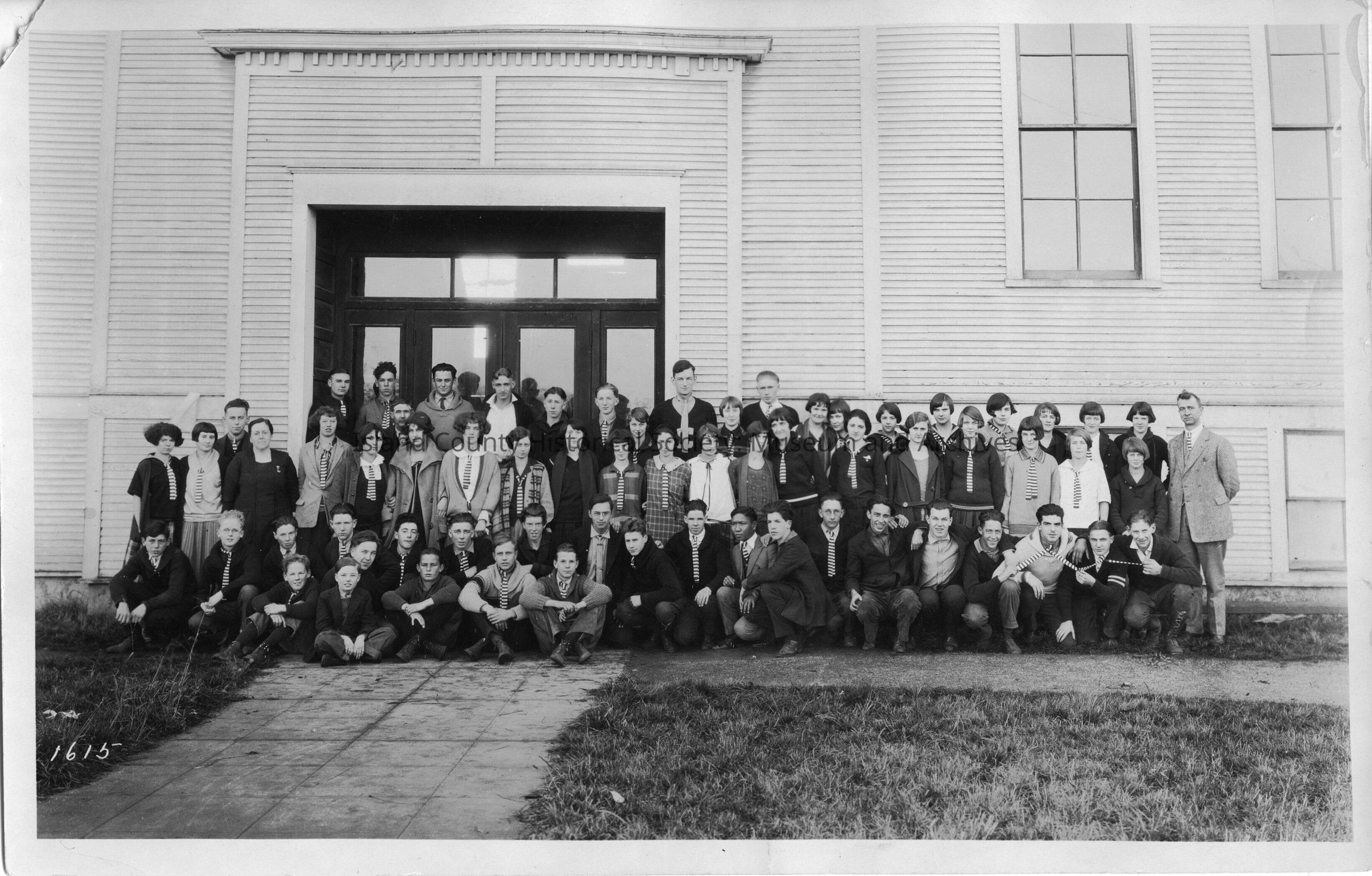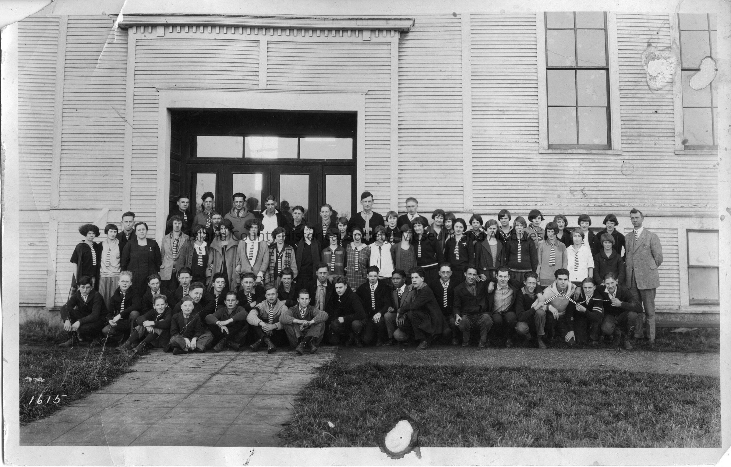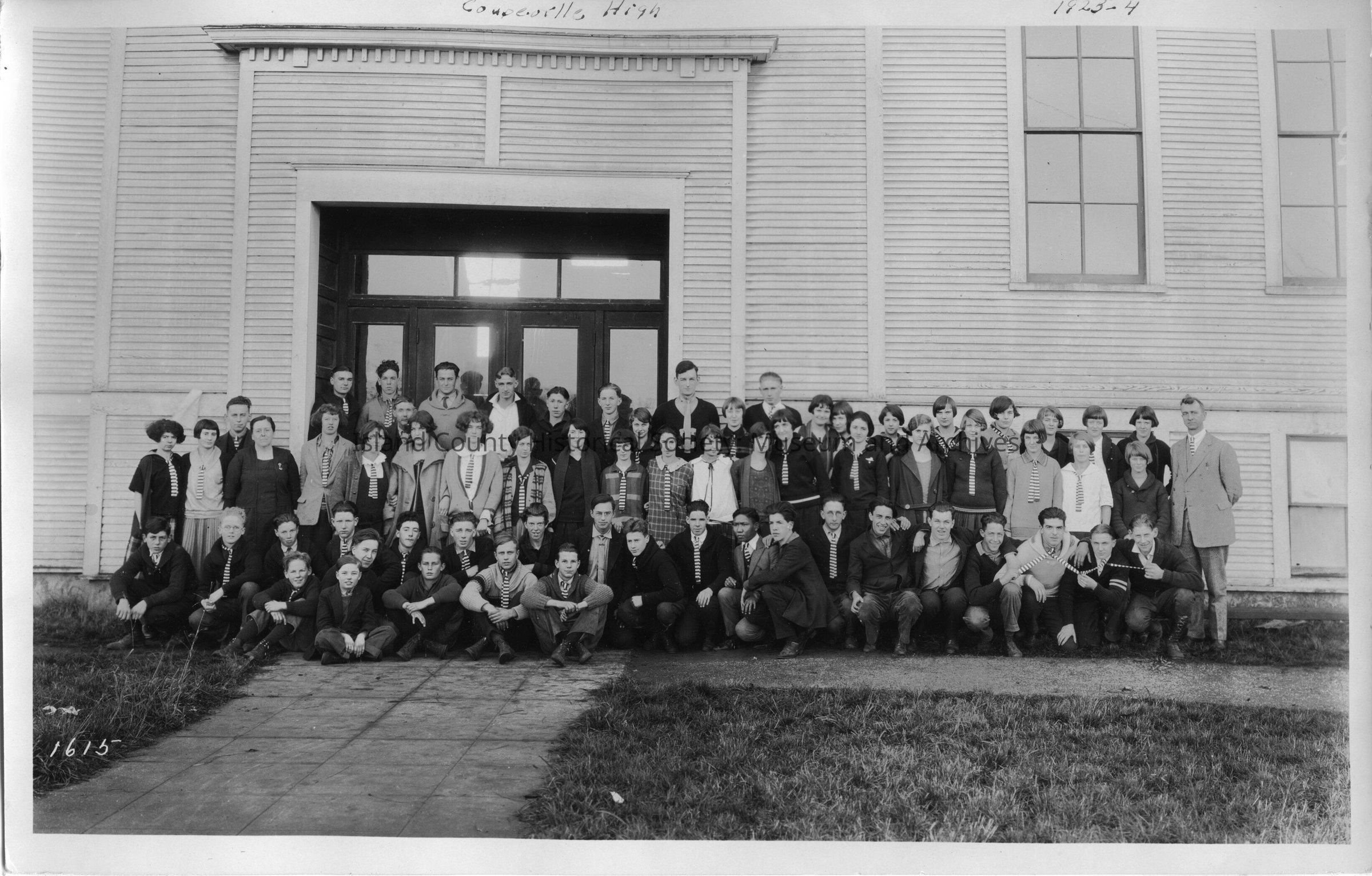 Three copies of Coupeville High School students and teachers standing in front of door to school in 1923-24. Most of students are identified on the back.