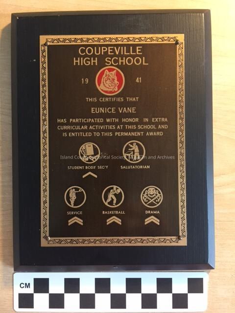 Coupeville High School commemerative plaque, 1941. Metal embossed plate nailed to wooden base. 13 cm x 17 cm. [Item is being transfered from archives file system, where is was filed in Personal Documents of the Vane Collection, to collections.]