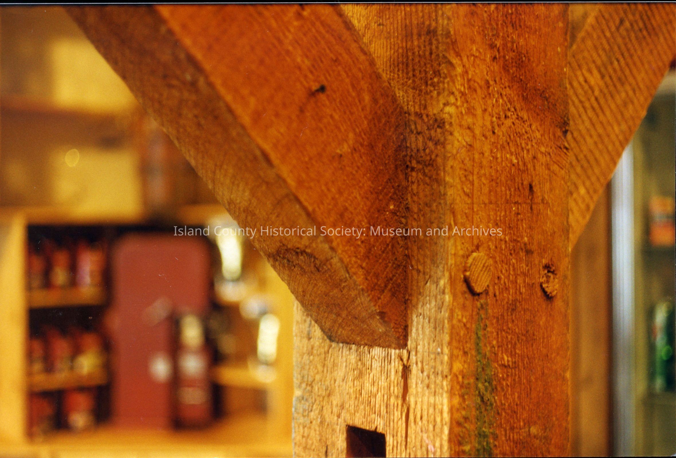 Close-up detail shot of a wooden beam inside a building, possibly #22 NW Front Street, Coupeville. C. 1997-1998.