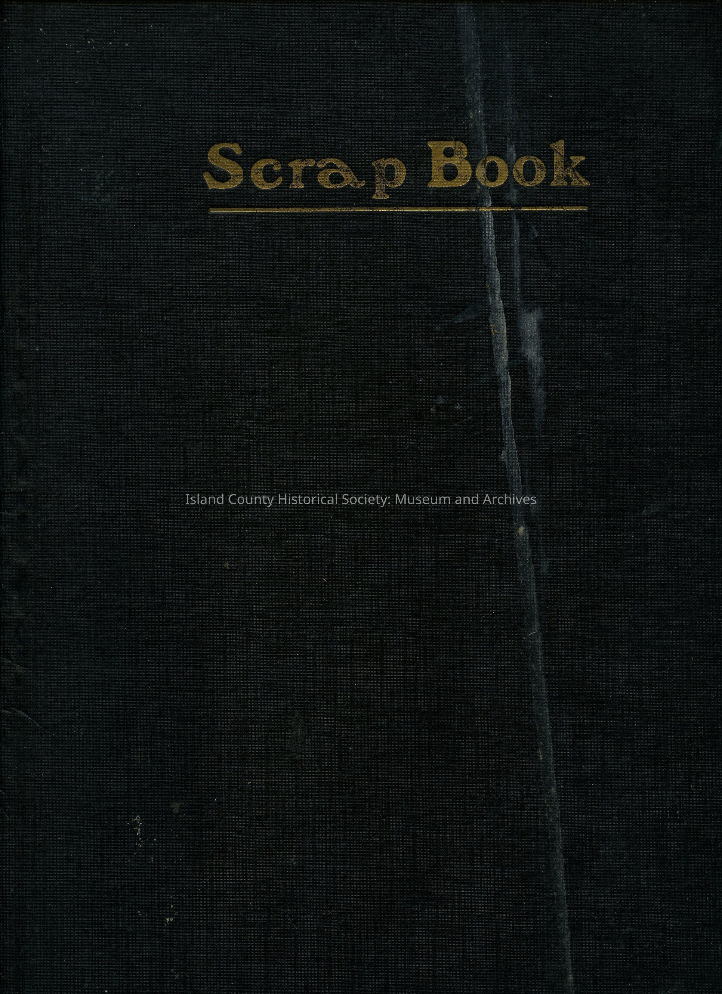 A black scrapbook with gold lettering and a white stain on the front, made by Bernice Vane. The scrapbook contains clippings of newspaper articles relating to the Vane family.