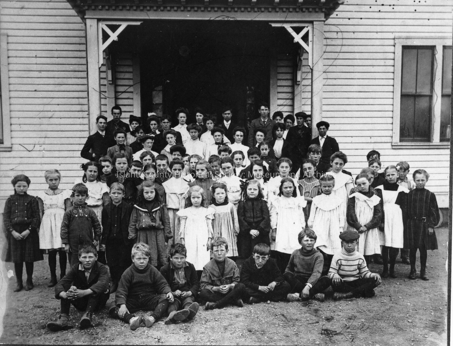 Coupeville School 1905. Students of all ages are gathered in front of porch.