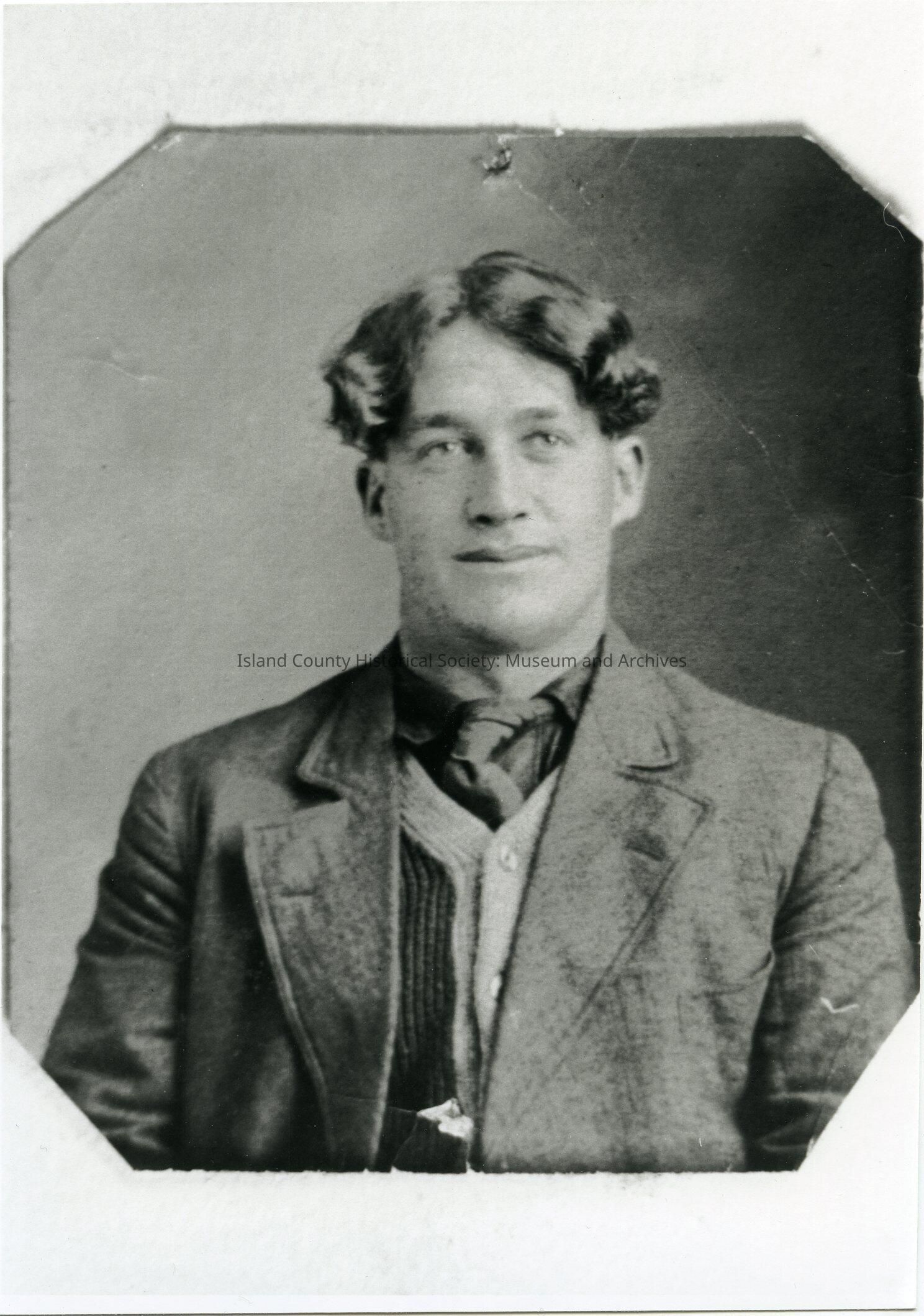 Photo of a man wearing a jacket,sweater vest/cardigan, and tie. His hair is parted almost in the middle and is wavy. This is a photocopy - the image has cut corners as if the orignal was in an album or photo holder. On the back: #1996 Oscar Wold, Coupeville, Wash. c1900 from the collection of Judith Allison Walters, of Bothell WA.