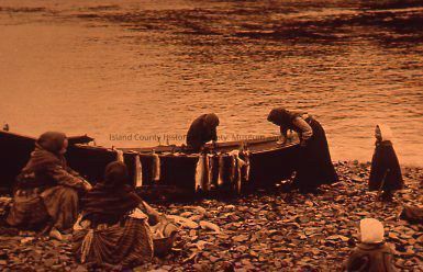 Photograph of Indigenous women and children of the Pacific Northwest around a canoe, cleaning fish.
