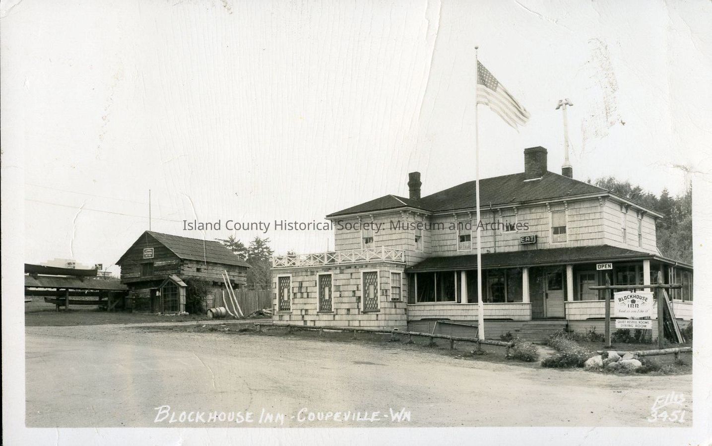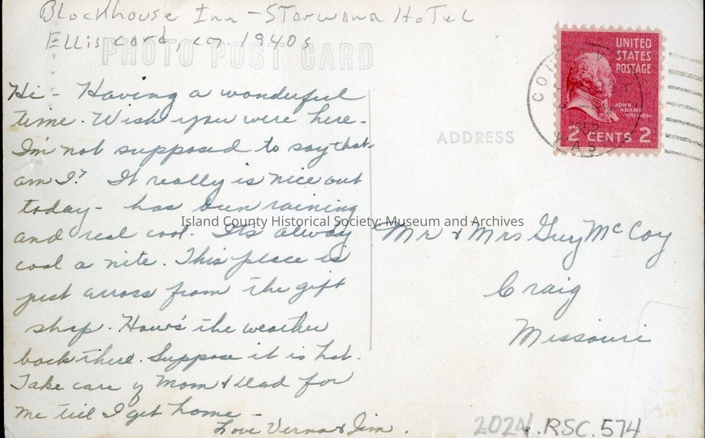 Postcard depicting the Blockhouse Inn (right) and Alexander Blockhouse (left). Postcard is addressed to Mr. and Mrs. Guy McCoy of Craig, Missouri. Postmarked 25 July 1952. Photo by Ellis.